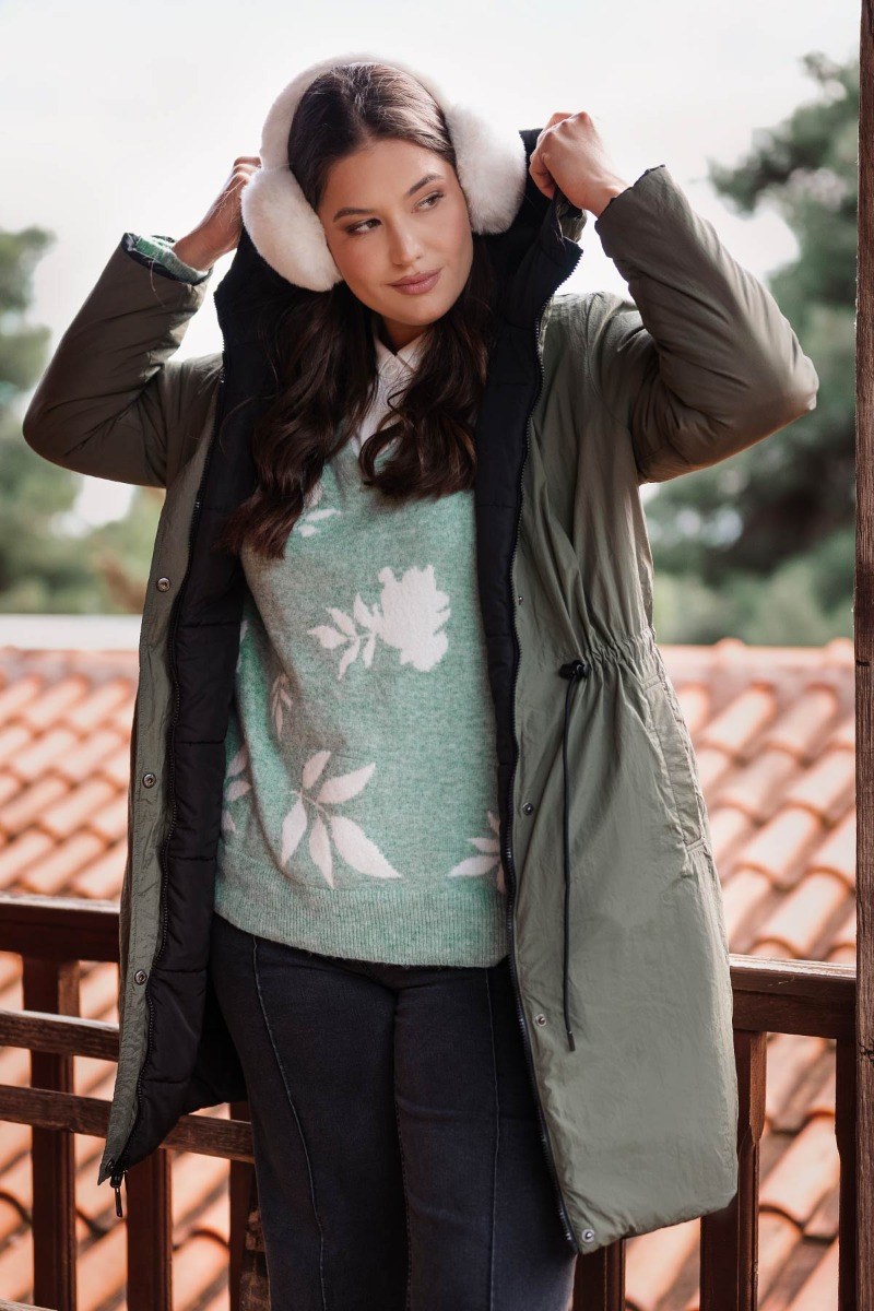 - Αυτό το μακρύ, αδιάβροχο μπουφάν διπλής όψης, είναι ένα ευέλικτο κομμάτι που σας επιτρέπει να αλλάζετε στυλ ανάλογα με τη διάθεση. Η μία όψη διαθέτει οριζόντιες ραφές για κλασική puffer εμφάνιση, ενώ η άλλη είναι λεία και με κορδόνι στη μέση, προσφέροντας πιο εφαρμοστή εφαρμογή. Και οι δύο όψεις διαθέτουν ενσωματωμένη κουκούλα με κορδόνια ρύθμισης και κλείσιμο με φερμουάρ, ενώ το μήκος του εξασφαλίζει πλήρη κάλυψη και προστασία από το κρύο και τη βροχή. Για μία εμφάνιση από το πρωί έως το απόγευμα, φορέστε την puffer όψη πάνω από ένα σύνολο με φαρδιά πλεκτά παντελόνια και πουλόβερ, ολοκληρώνοντας με sneakers ή άνετα μποτάκια. Για πιο σικάτες εξόδους, γυρίστε στη λεία όψη, φορέστε το πάνω από ένα πλεκτό φόρεμα με ψηλές μπότες, τονίζοντας τη μέση με το κορδόνι, και κρατήστε μια τσάντα ώμου. Το μοντέλο έχει ύψος 180 εκ στήθος 107 μέση 95 περιφέρεια 122 και φοράει το μέγεθος Μ