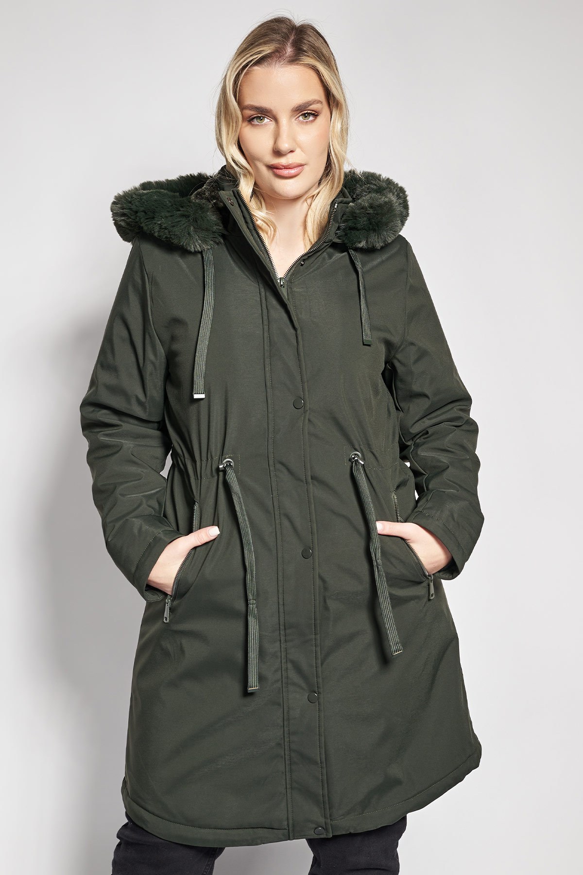 - Αυτό το παρκά μπουφάν διαθέτει ψηλό λαιμό που καταλήγει σε αποσπώμενη κουκούλα με πλούσια επένδυση συνθετικής γούνας αναδεικνύοντάς το σε ένα άκρως κομψό κομμάτι. Δαθέτει μακριά μανίκια με εσωτερική ελαστική μανσέτα, κεντρικό κλείσιμο με φερμουάρ που καλύπτεται από πατιλέτα με σούστες, ενώ εσωτερικά είναι πλήρως επενδυμένο με μαλακή γούνα προσφέροντας απόλυτη ζεστασιά. Σε ίσια γραμμή που τονίζεται στη μέση με ρυθμιζόμενο κορδόνι και με λειτουργικές πλάγιες τσέπες που κλείνουν με φερμουάρ. Αποτελεί την ιδανική επιλογή για να συνδυαστεί με ένα πλεκτό φόρεμα και ψηλές μπότες πάνω από το γόνατο για ένα κομψό και ζεστό χειμερινό look. Εναλλακτικά, συνδυάστε το με ένα τζιν παντελόνι σε γραμμή καμπάνα και ένα εφαρμοστό ζιβάγκο, ολοκληρώνοντας το σύνολο με ορειβατικά μποτάκια με τρακτερωτή σόλα για ένα δυναμικό και σύγχρονο look πόλης. Το μοντέλο έχει ύψος 176 εκ στήθος 99 μέση 85 περιφέρεια 114 και φοράει το μέγεθος 44