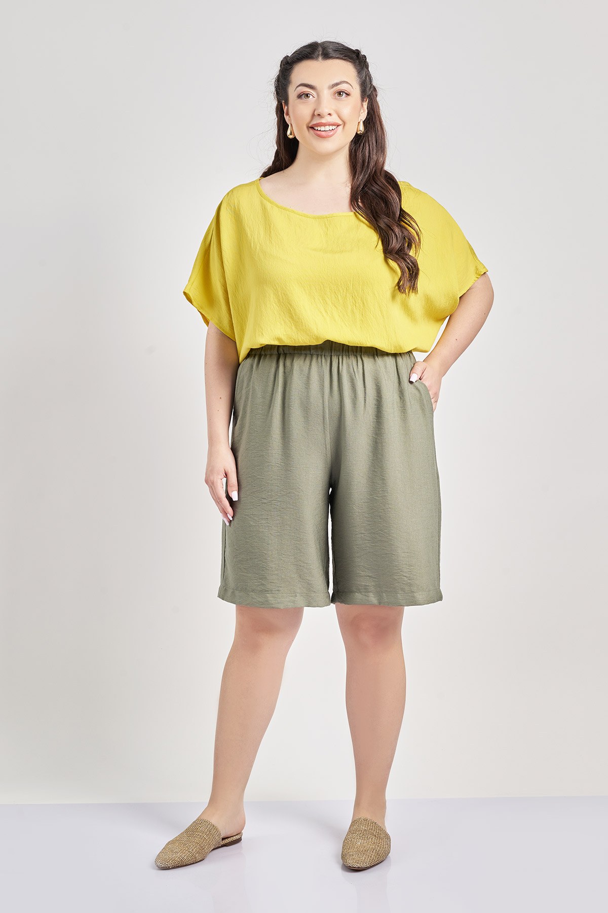- Βερμούδα από σύμμεικτο ρεγιόν σε όψη λινού. Ανάγλυφη υφή. Πλαϊνές τσέπες. Λάστιχο στη μέση. Σε ίσια γραμμή. Το μοντέλο έχει ύψος 172 εκ, στήθος 108, μέση 94, περιφέρεια 111 και φοράει το μέγεθος S