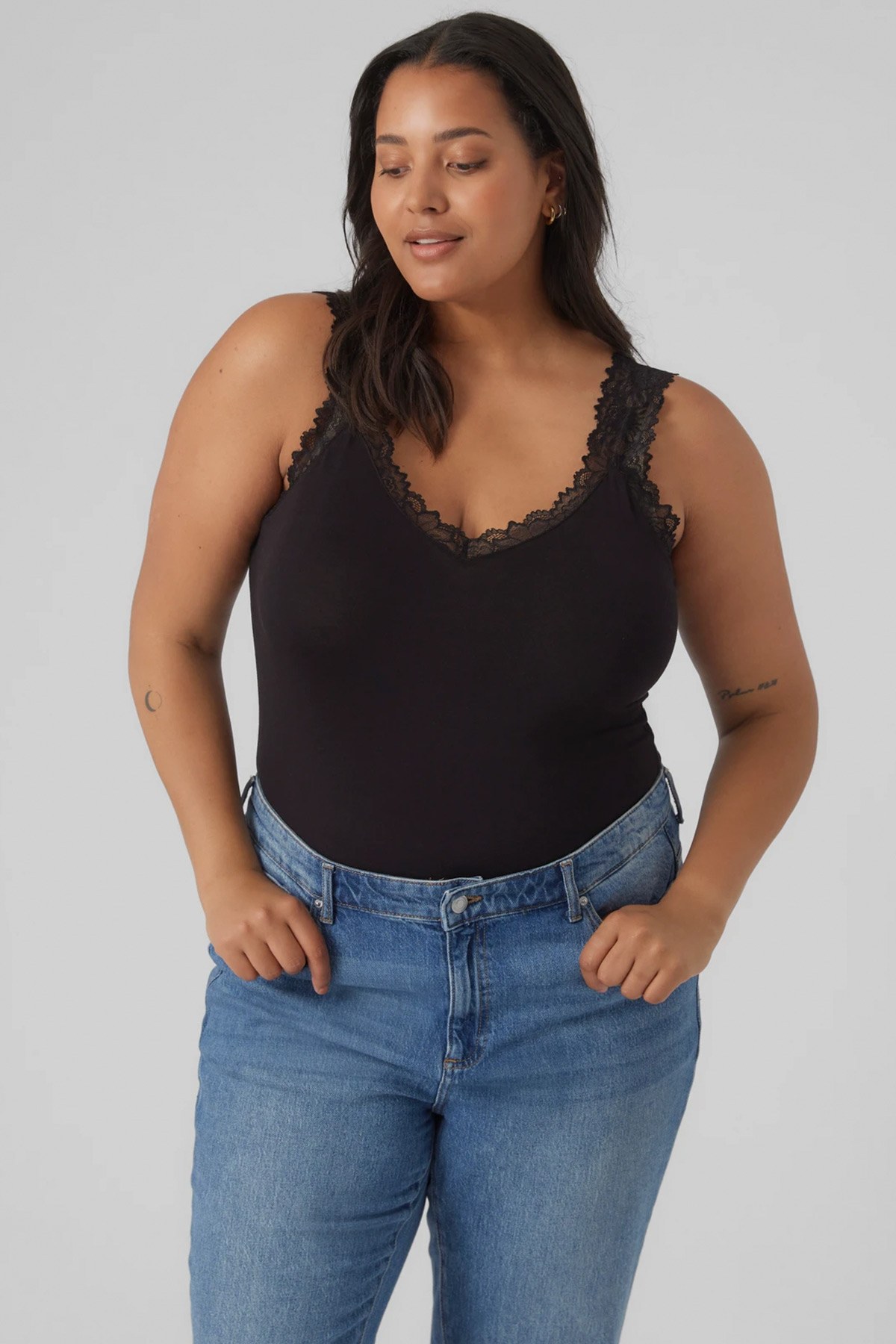 - Ελαστικό αμάνικο τοπ μονόχρωμο. Λεπτομέρεια δαντέλας και στρογγυλή λαιμόκοψη.