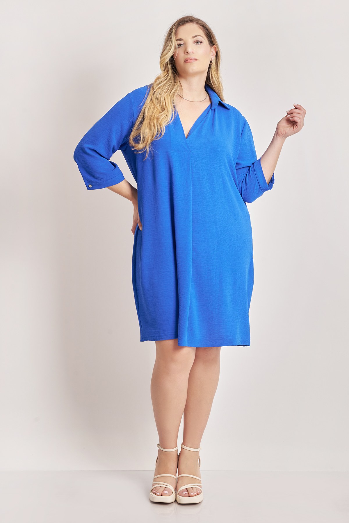 - Μίντι φόρεμα σε washed ύφανση με δροσερή κι ανάγλυφη υφή. V λαιμόκοψη με γιακά. Μανίκια 3/4 με μανσέτα με κουμπί. Πιέτα μπροστά. Στυλ πουκαμίσας. Το μοντέλο έχει ύψος 179 εκ, στήθος 109, μέση 89, περιφέρεια 119 και φοράει το μέγεθος S