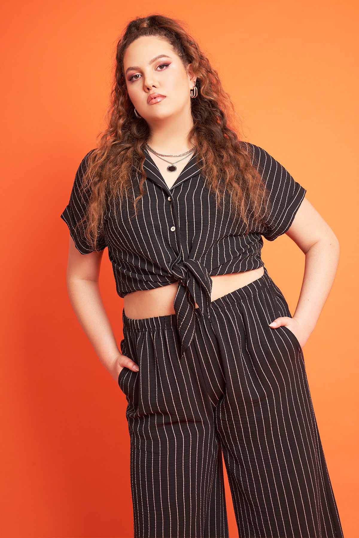 - Ριγέ cropped πουκάμισο σε όψη λινού. Γιακάς με πέτο. Μπροστινό κούμπωμα με κουμπιά. Δέσιμο μπροστά. Άνετη γραμμή. Συμπληρώστε το σετ με την παντελόνα 012410206086 ή το σορτς 012410206087.