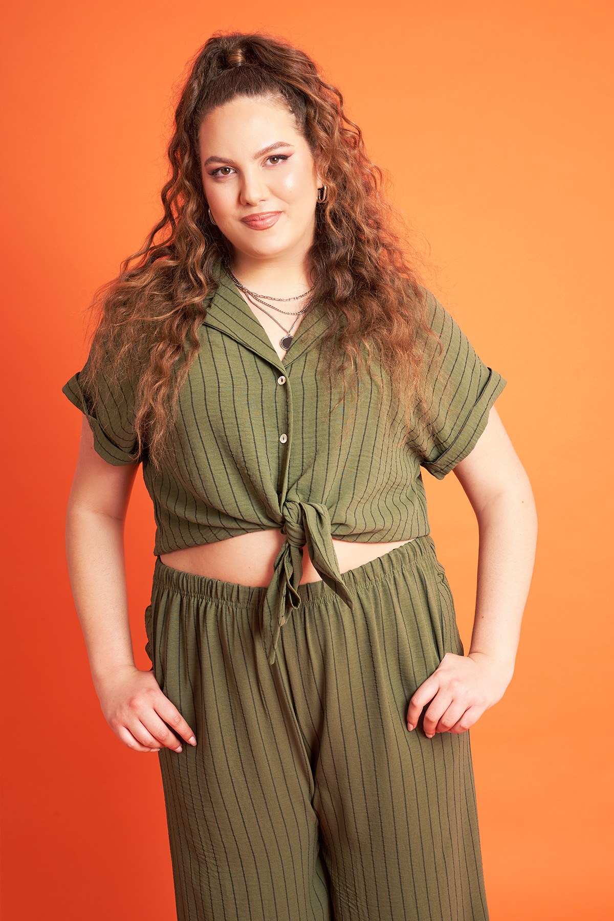 - Ριγέ cropped πουκάμισο σε όψη λινού. Γιακάς με πέτο. Μπροστινό κούμπωμα με κουμπιά. Δέσιμο μπροστά. Άνετη γραμμή. Συμπληρώστε το σετ με την παντελόνα 012410206086 ή το σορτς 012410206087.