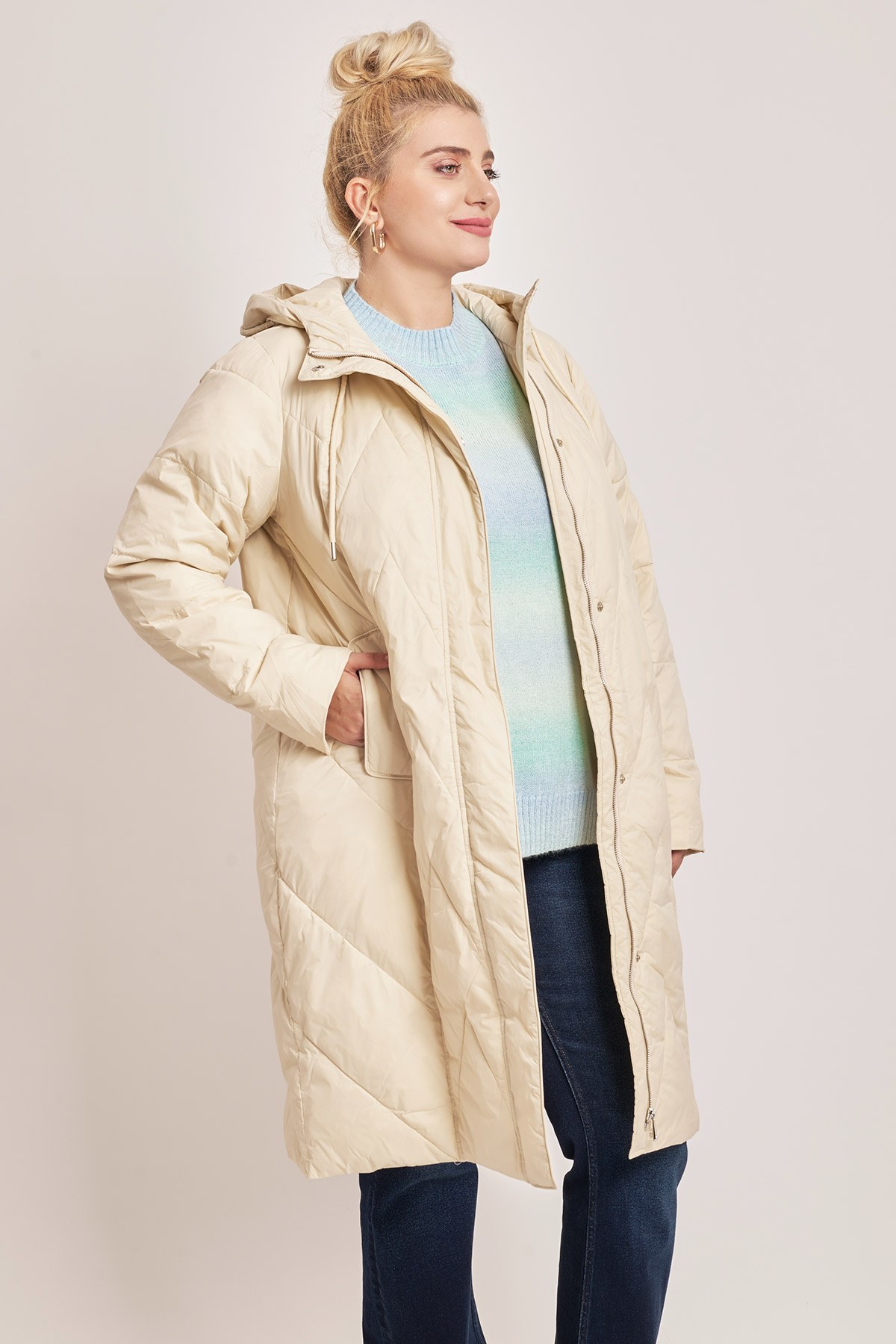 - Μακρύ μπουφάν καπιτονέ αδαβροχοποιημένο, με ανθεκτικότητα στο νερό. Ενσωματωμένη κουκούλα με ρυθμιζόμενο κορδόνι. Μπροστινό κούμπωμα με κουμπιά σούστες και φερμουάρ. Μακριά μανίκια. Με φόδρα. Σε ίσια γραμμή. Πλαϊνές τσέπες. Το μοντέλο έχει ύψος 177εκ, στ