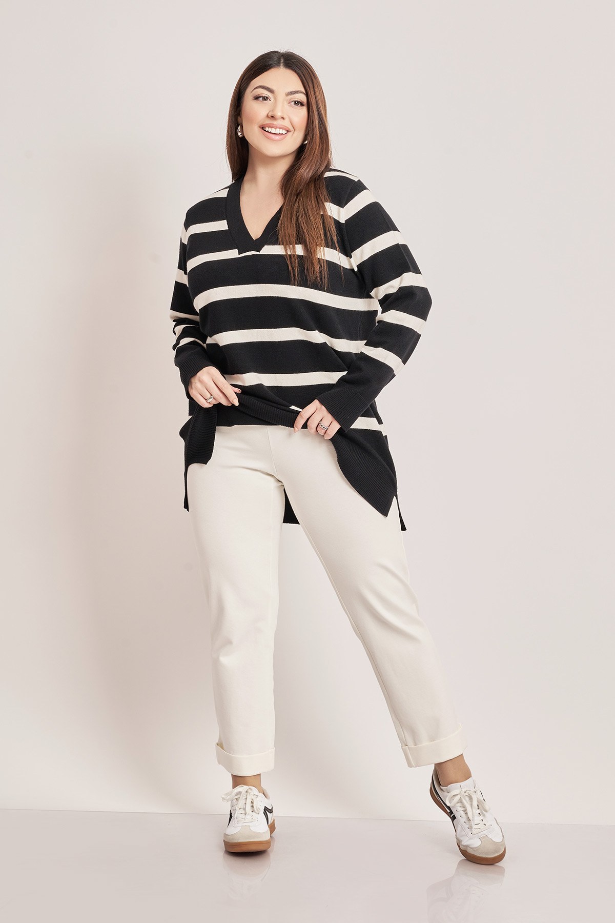 - Παντελόνι 7/8 από ελαστικό ύφασμα punto που δε διαγράφει. Με ελαστική μέση. Σε ίσια γραμμή. Ρεβέρ στο τελείωμα. Συνδυάζεται με ριχτά πουλόβερ ή πουκαμίσες για όλη μέρα και με σακάκια για σικάτες εμφανίσεις. Το μοντέλο έχει ύψος 172 εκ, στήθος 108, μέση 94, περιφέρεια 111 και φοράει το μέγεθος S