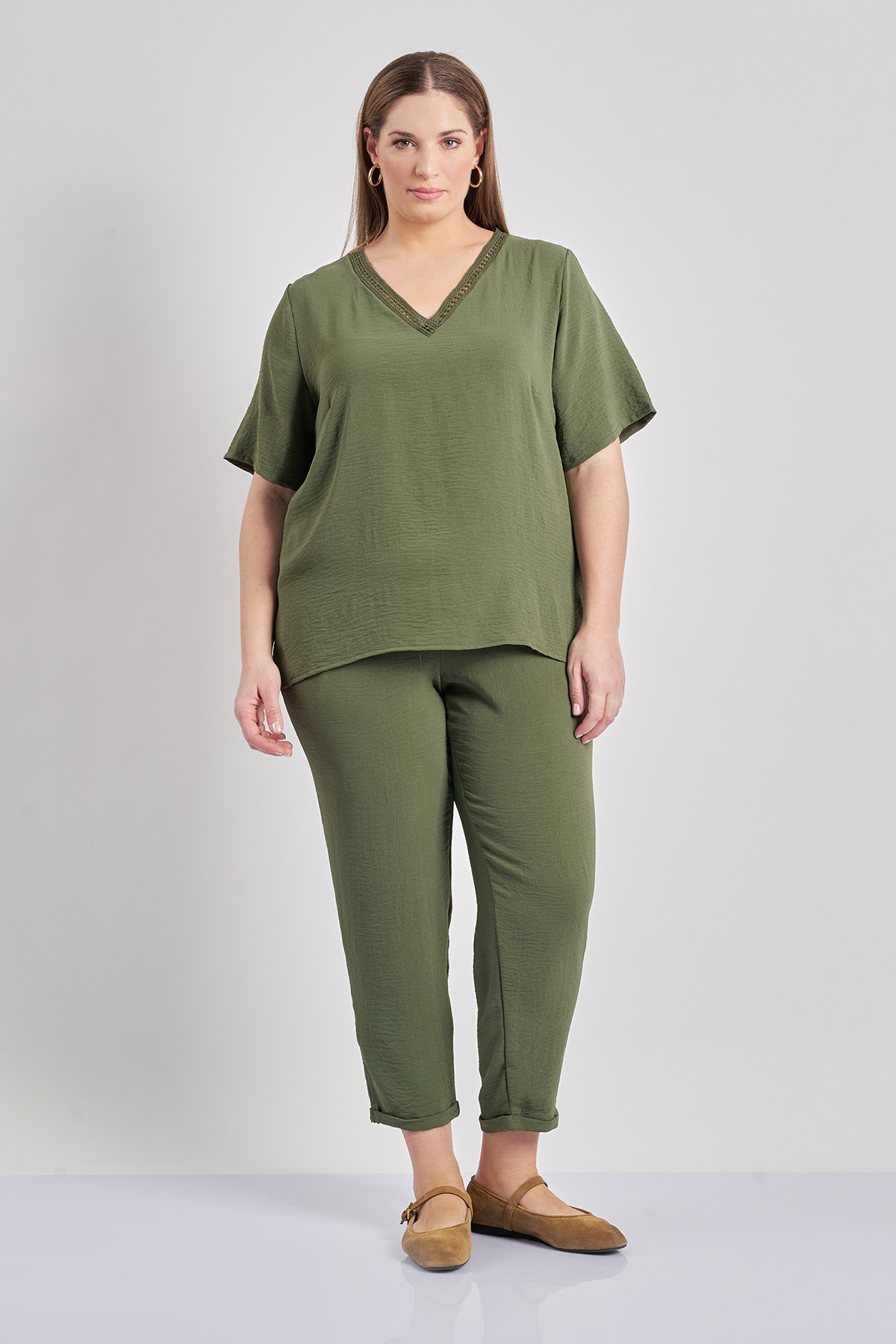 - Παντελόνι 7/8 σε ανάλαφρο ύφασμα washed με ανάγλυφη υφή. Ελαστική μέση με φάσα μπροστά. Με πλαϊνές τσέπες. Γραμμή tapered που στενεύει στο τελείωμα. Με ρεβέρ. Συμπληρώστε το σετ με τις μπλούζες ή τοπ από το ίδιο ύφασμα washed με κωδικούς 012510107669, 012510105575, 012510108475, 012510107675, 012510108186, 012510105574. Συνδυάζεται επίσης με το washed μπλέιζερ με κωδικό 012410705869. Το μοντέλο που φοράει τα χρώματα μαύρο και μπλε έχει ύψος 180 εκ, στήθος 107, μέση 95, περιφέρεια 122 και φοράει το μέγεθος S. Το μοντέλο που φοράει τα χρώματα εκρού και ίντιγκο έχει ύψος 177εκ, στήθος 110, μέση 85, περιφέρεια 115 και φοράει μέγεθος S.
