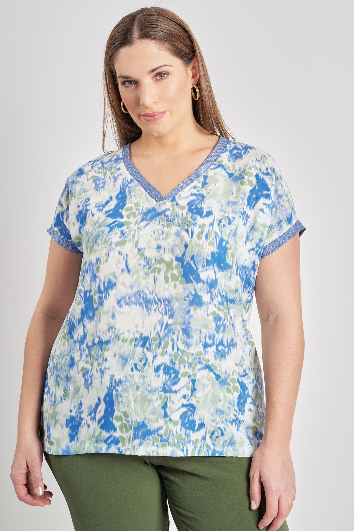 - Μπλούζα με digital τύπωμα σε αφηρημένο φλοράλ μοτίβο στο μπροστινό μέρος. Μονόχρωμη πλάτη με ελαστικότητα. Λαιμόκοψη με V άνοιγμα, κοντά μανίκια και διακοσμητικές τρέσες με λούρεξ. Το μοντέλο έχει ύψος 180 εκ, στήθος 107, μέση 95, περιφέρεια 122 και φοράει το μέγεθος S