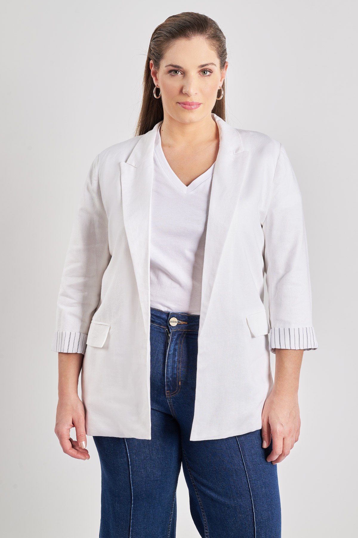 Ανοιχτό μπλέιζερ σύμμεικτο λινό και ριγέ λεπτομέρεια