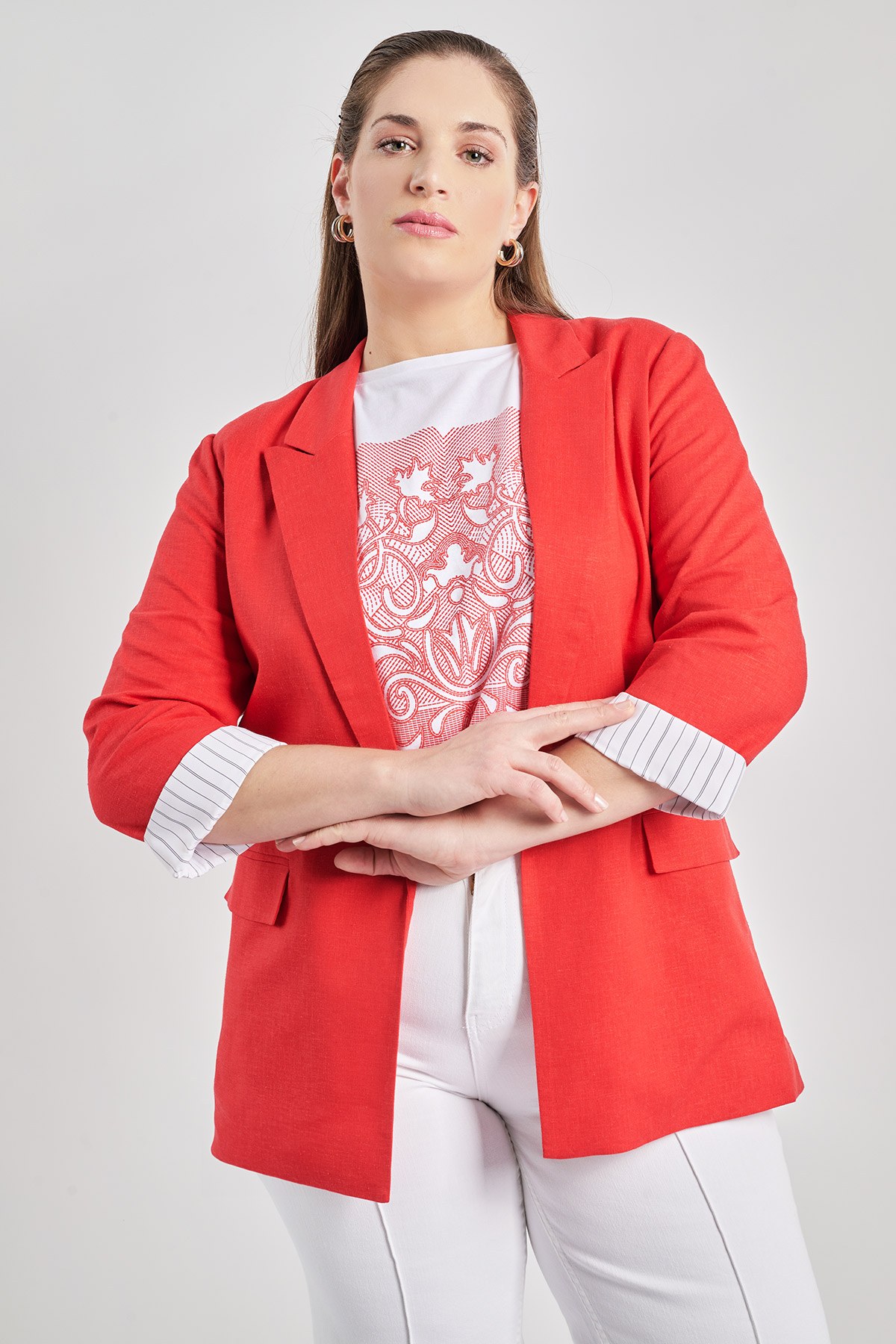 Ανοιχτό μπλέιζερ σύμμεικτο λινό και ριγέ λεπτομέρεια