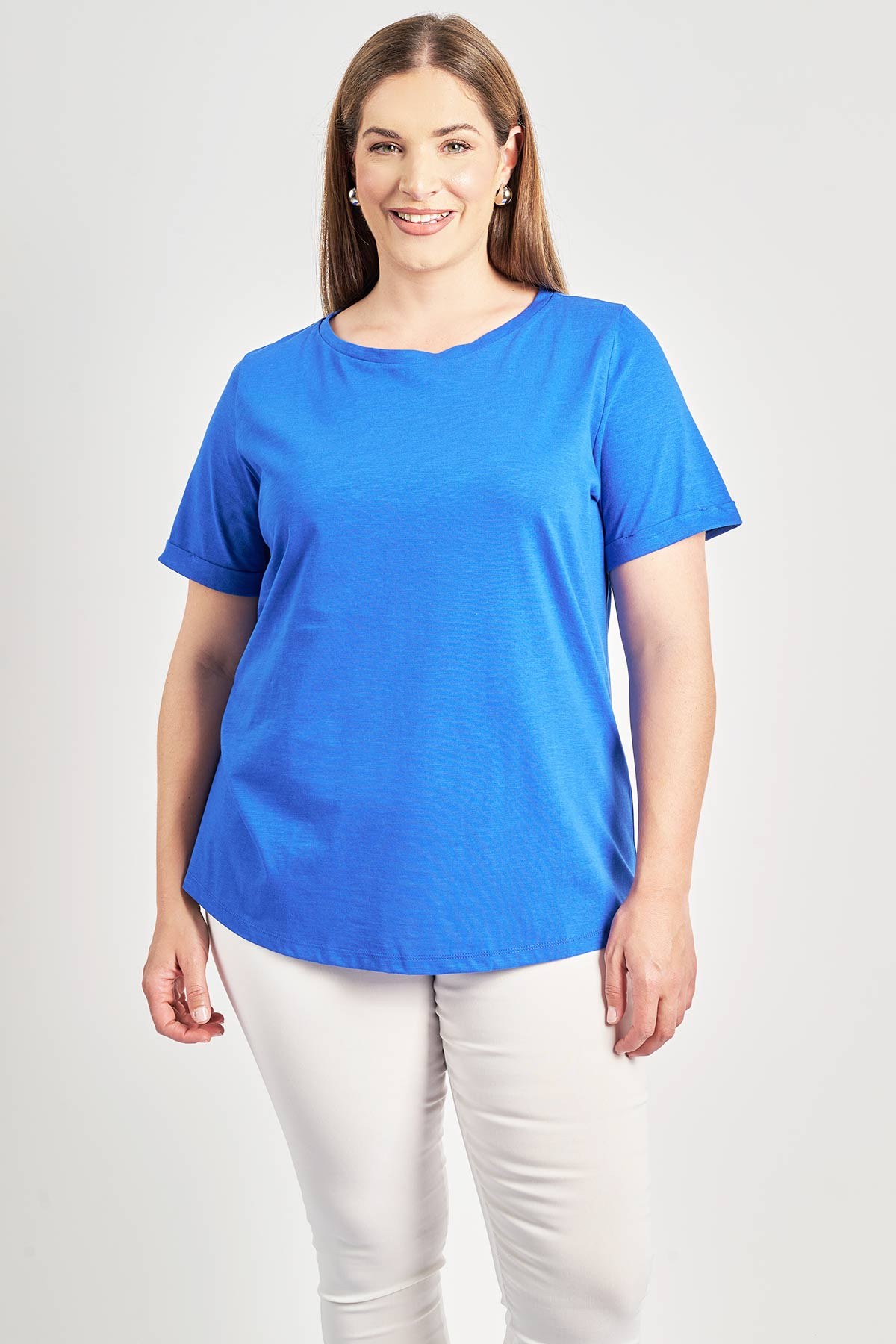 - Κοντομάνικη μπλούζα basic σε βαμβακερή φλάμα. Κοντά μανίκια με ρεβέρ. Στρογγυλή λαιμόκοψη. Σε Α γραμμή με ελαφρώς στρογγυλεμένο τελείωμα. Μήκος που καλύπτει τους γοφούς. Συνδυάζεται τέλεια με τζιν και slim παντελόνια για casual chic εμφανίσεις. Ιδανική επιλογή για μια μπλούζα που μπορεί να φορεθεί μέσα από ψηλόμεσα παντελόνια και να τονιστεί με statement αξεσουάρ. Το μοντέλο έχει ύψος 180 εκ, στήθος 107, μέση 95, περιφέρεια 122 και φοράει το μέγεθος S