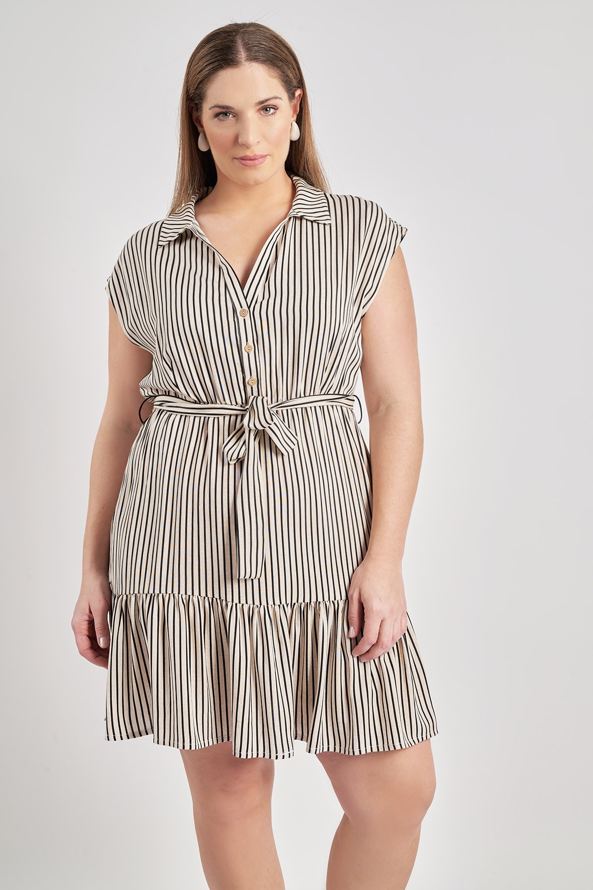- Φόρεμα μίνι από ριγέ βιέλα βισκόζης, με αποσπώμενη δετή ζώνη. Κοντά μανίκια. Γιακάς πουκαμίσου με V λαιμόκοψη και άνοιγμα εμπρός στο κορσάζ με πατιλέτα και ξύλινα κουμπιά. Ελαστική μέση και βολάν στο τελείωμα. Το μοντέλο έχει ύψος 180 εκ, στήθος 107, μέση 95, περιφέρεια 122 και φοράει το μέγεθος S