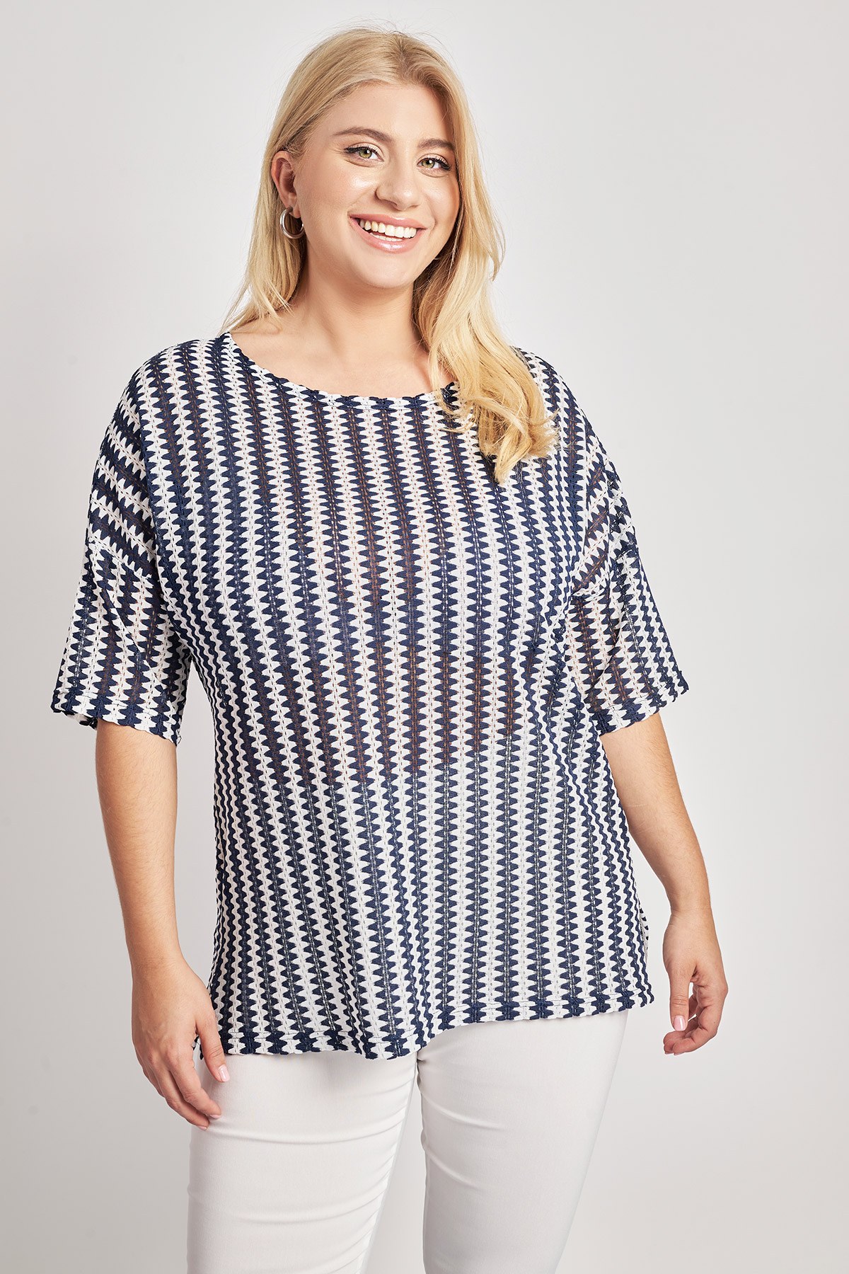 - Μπλούζα με ζακάρ σχέδιο σε όψη ριγέ. Στρογγυλή λαιμόκοψη. Κοντά μανίκια ζαπονέ. Σε ίσια γραμμή με πλαϊνά ανοίγματα. Το μοντέλο έχει ύψος 177εκ, στήθος 110, μέση 85, περιφέρεια 115 και φοράει μέγεθος S