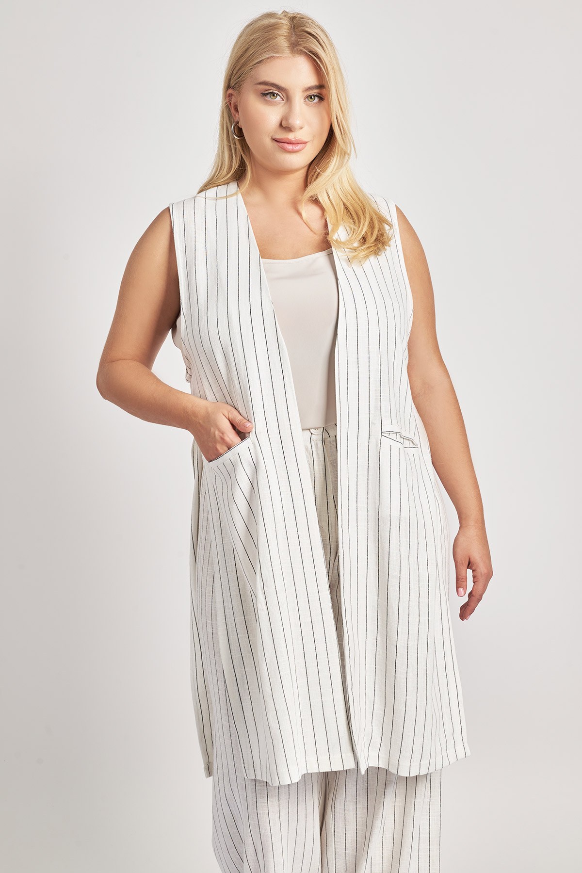 Μακρύ γιλέκο ριγέ με ζώνη σύμμεικτο λινό