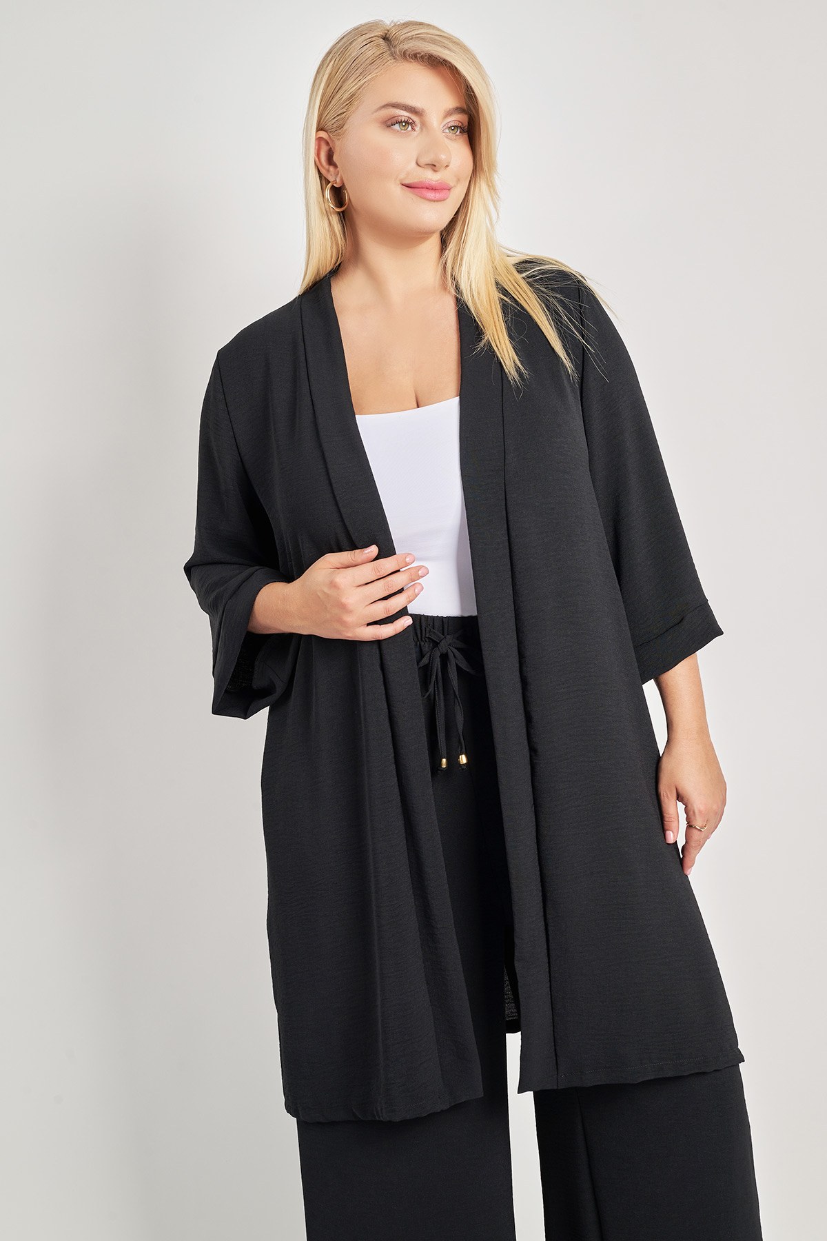 - Μακρύ κιμονό σε δροσερή washed ύφανση με ανάγλυφη υφή. Χωρίς κούμπωμα. Με ενσωματωμένο πέτο. Φαρδιά μανίκια 3/4. Με πλαϊνά ανοίγματα. Συμπληρώστε το σετ με την washed παντελόνα 012410205584 και το lingerie τοπ 012510105574. Το μοντέλο έχει ύψος 177εκ, στήθος 110, μέση 85, περιφέρεια 115 και φοράει μέγεθος S