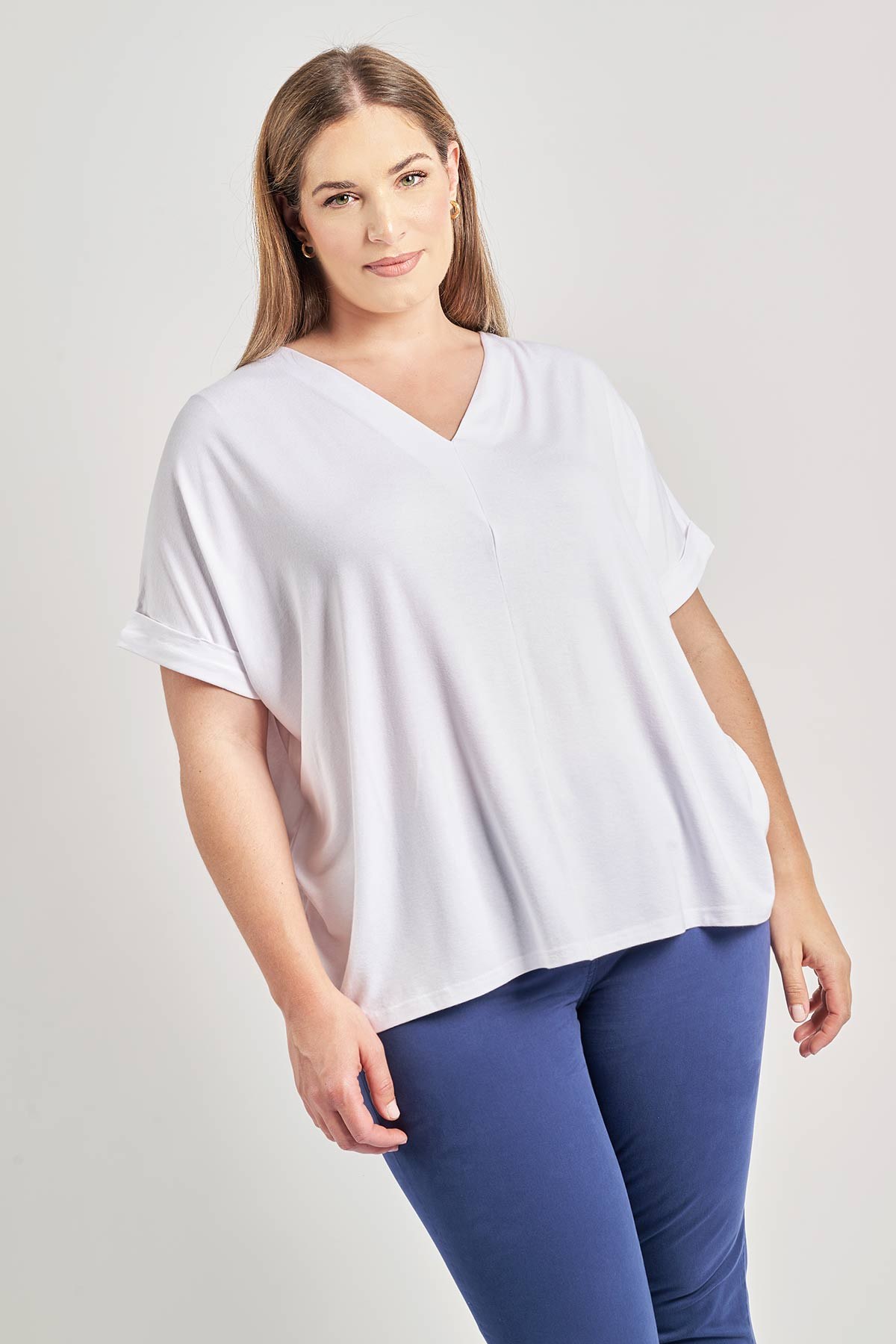 - Μπλούζα από ελαστική βισκόζη. Κοντά μανίκια με ρεβέρ στο τελείωμα. Λαιμόκοψη V. Διαθέτει κεντρική κάθετη ραφή στο μπροστινό μέρος. Σε ίσια γραμμή. Το μοντέλο έχει ύψος 180 εκ, στήθος 107, μέση 95, περιφέρεια 122 και φοράει το μέγεθος S