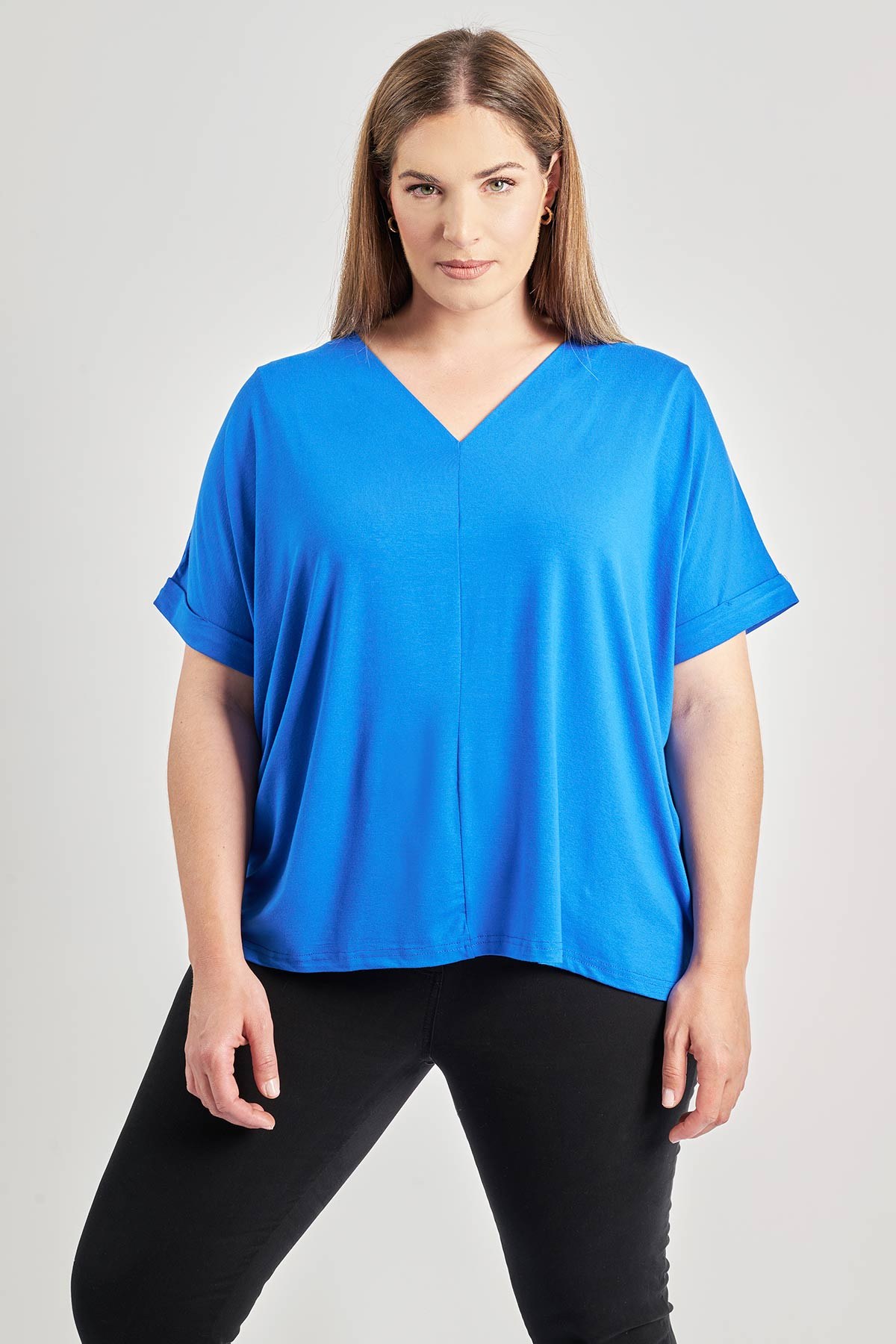 - Μπλούζα από ελαστική βισκόζη. Κοντά μανίκια με ρεβέρ στο τελείωμα. Λαιμόκοψη V. Διαθέτει κεντρική κάθετη ραφή στο μπροστινό μέρος. Σε ίσια γραμμή. Το μοντέλο έχει ύψος 180 εκ, στήθος 107, μέση 95, περιφέρεια 122 και φοράει το μέγεθος S