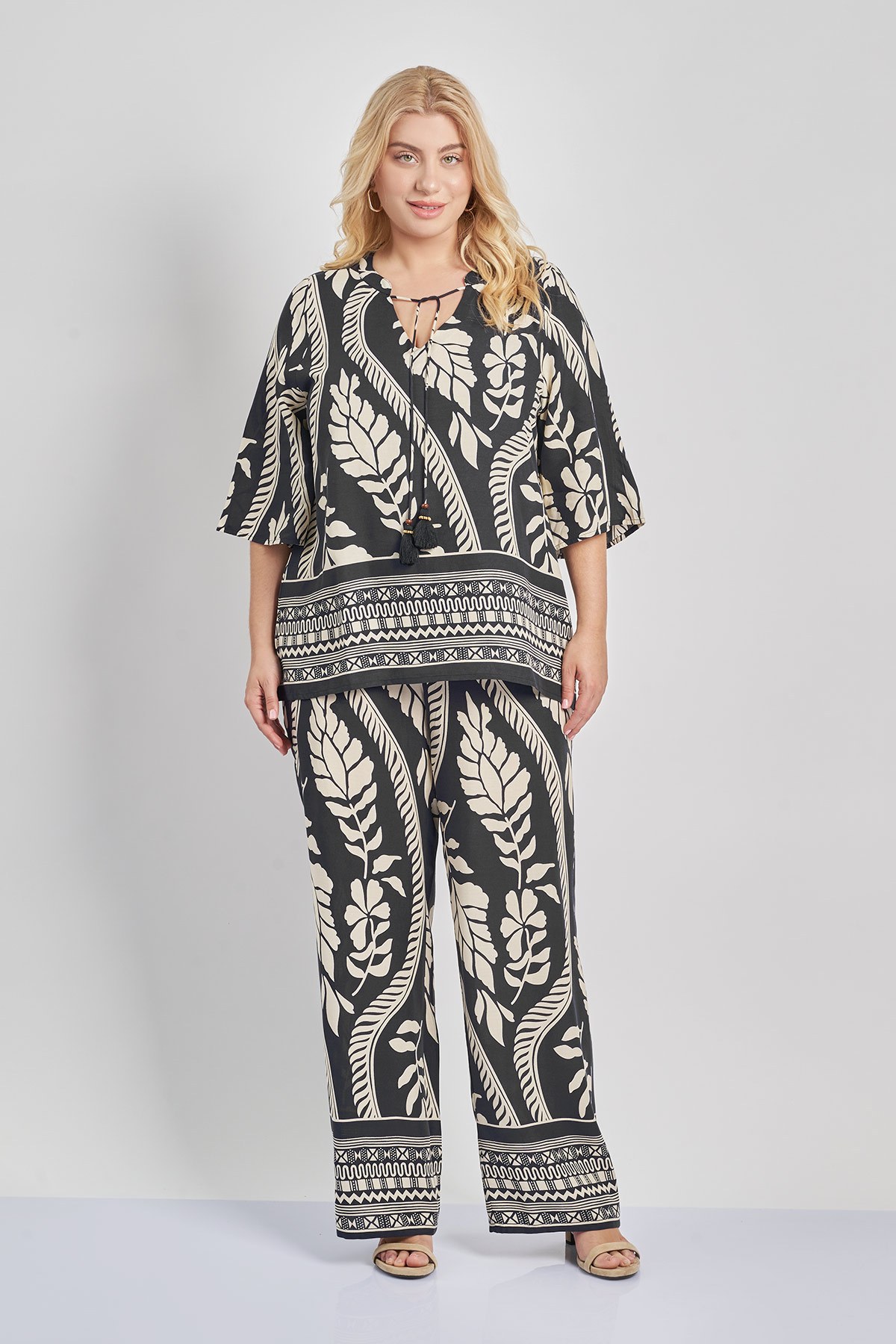 - Παντελόνα από βισκόζη σε botanical print. Ελαστική μέση και δέσιμο με κορδόνι και φουντάκια. Ολοκληρώστε το σετ με την μπλούζα 012510106798. Το μοντέλο έχει ύψος 177εκ, στήθος 110, μέση 85, περιφέρεια 115 και φοράει μέγεθος S