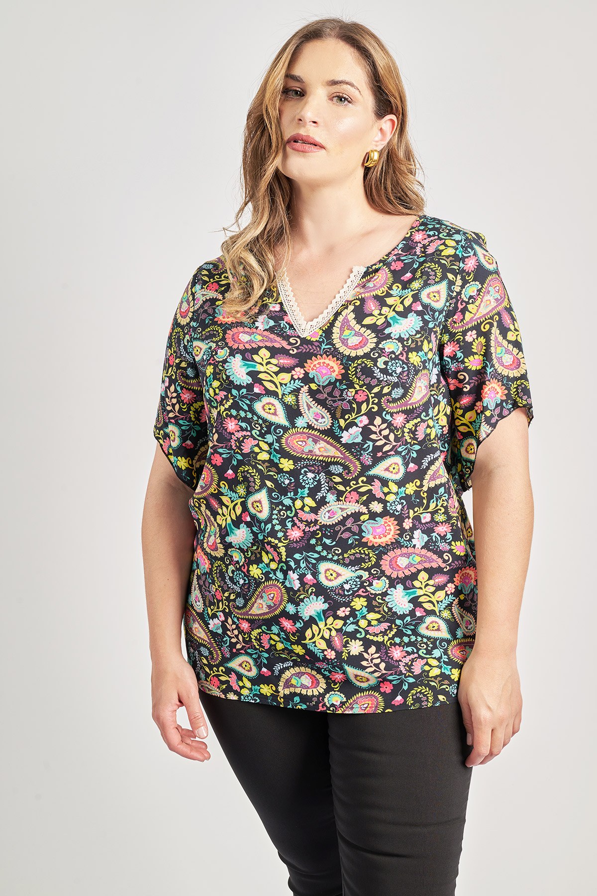 - Μπλούζα εμπριμέ από 100% ρεγίον. Κοντά μανίκια και λεαιμόκοψη V με διακόσμηση δαντέλας. Το μοντέλο έχει ύψος 180 εκ, στήθος 107, μέση 95, περιφέρεια 122 και φοράει το μέγεθος S