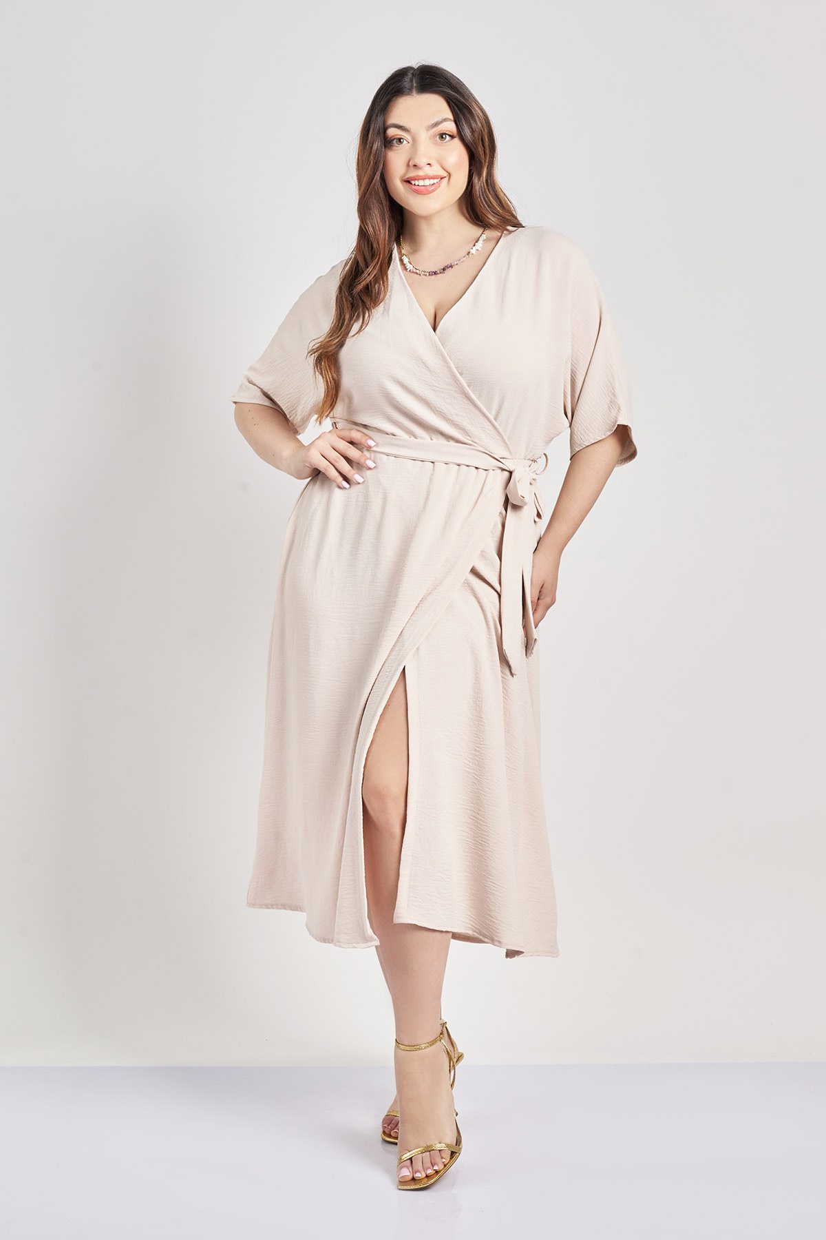 - Μίντι φόρεμα από ανάλαφρο ύφασμα washed με ανάγλυφη υφή. Κρουαζέ ντεκολτέ. Ελαστική μέση. Θηλάκια ζώνης και ζώνη ιδίας ύφανσης. Κοντά μανίκια ζαπονέ. Το μοντέλο έχει ύψος 172 εκ, στήθος 108, μέση 94, περιφέρεια 111 και φοράει το μέγεθος S