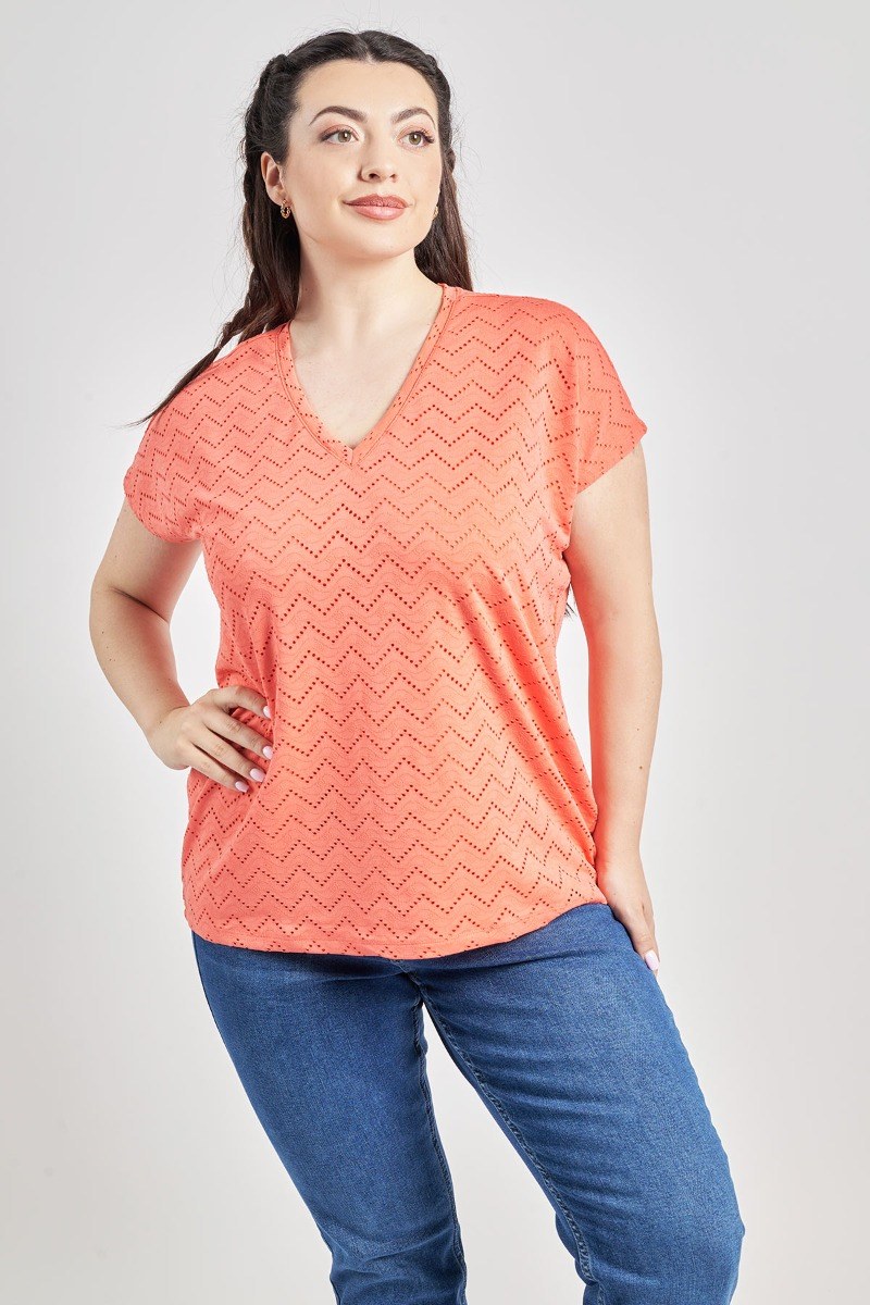 - Μπλούζα από ανακυκλωμένο πολυεστέρα. Διάτρητη με σχέδιο ζικ-ζακ/. Κοντά μανίκια τύπου νυχτερίδα. Λαιμόκοψη V. Σε ίσια γραμμή. Κανονική εφαρμογή Με φόδρα εσωτερική.
