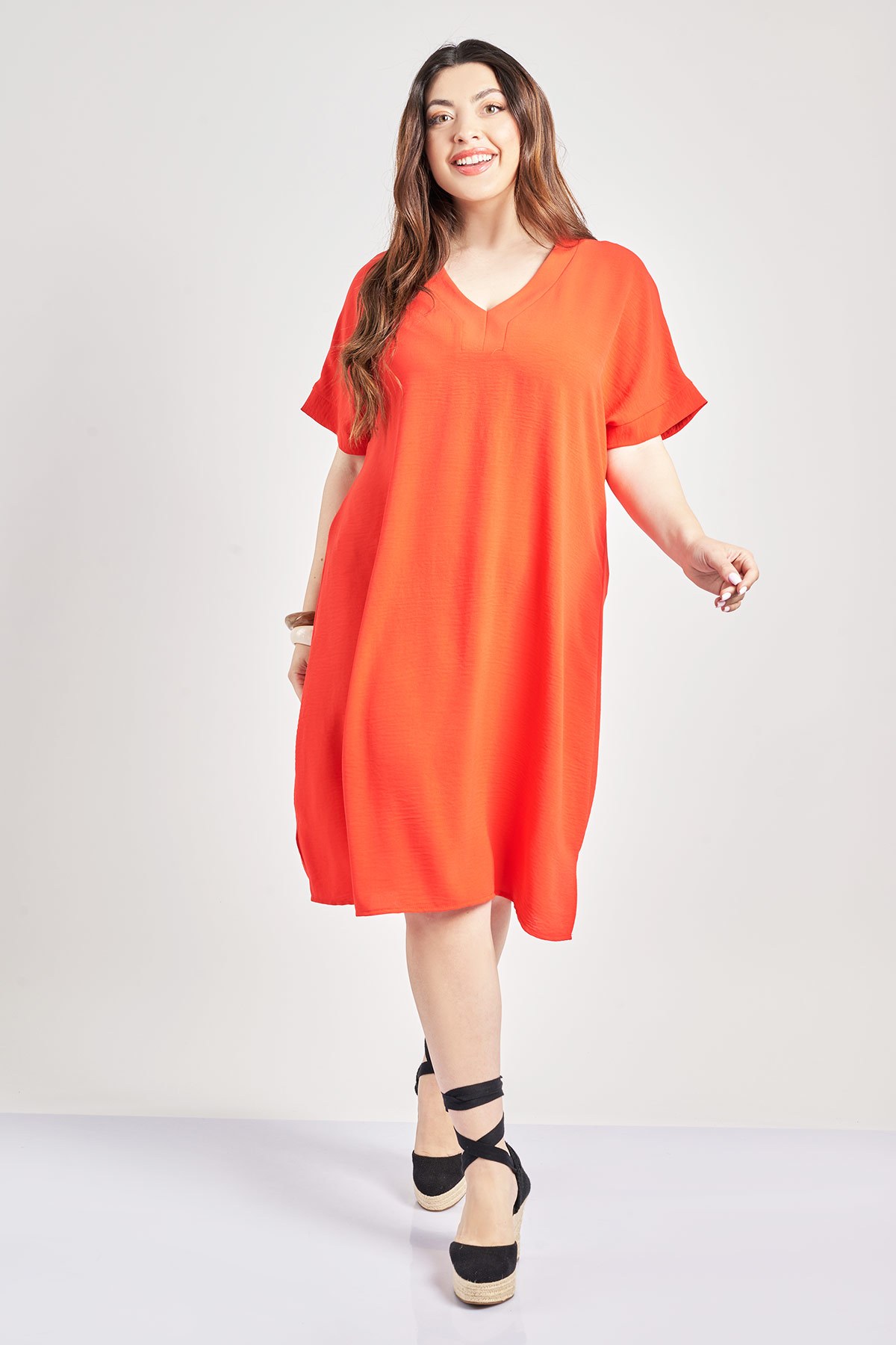 - Ανάλαφρο μίντι φόρεμα από ύφασμα washed με ανάγλυφη υφή. V λαιμόκοψη. Κοντά φαρδιά μανίκια. Σε ίσια γραμμή με πλαϊνά ανοίγματα. Το μοντέλο έχει ύψος 172 εκ, στήθος 108, μέση 94, περιφέρεια 111 και φοράει το μέγεθος S