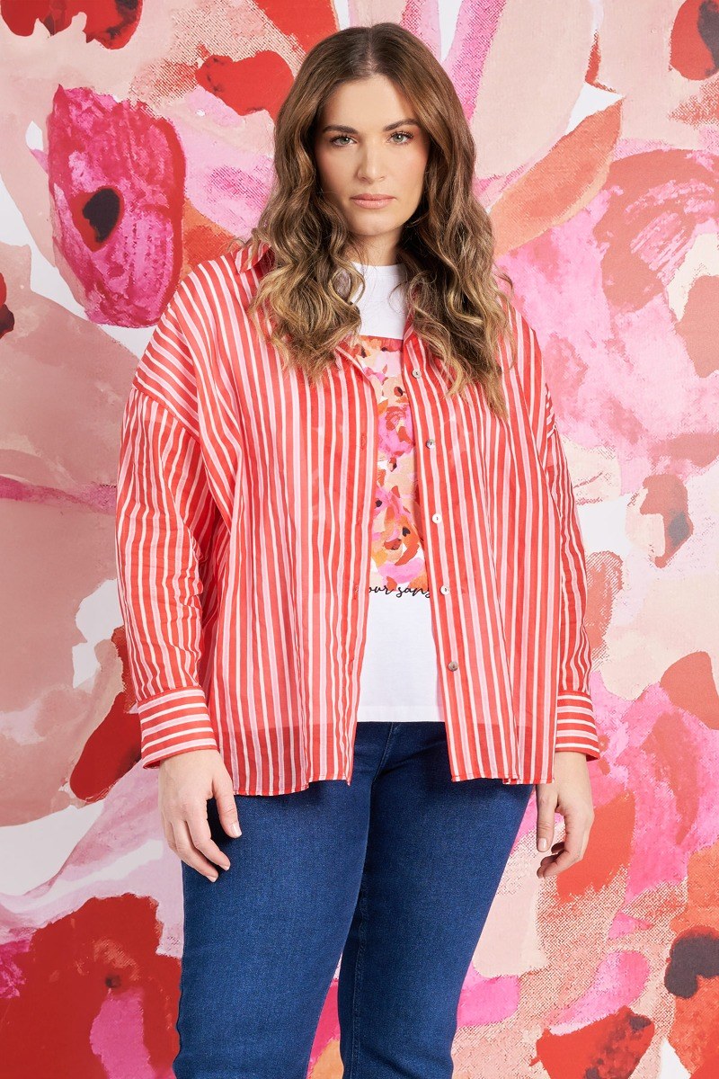 - Πουκάμισο από 100% βαμβάκι ριγέ. Γιακάς πουκαμίσου και μακριά μανίκια με μανσέτα. Κλείνει μπροστά με κουμπιά κατά μήκος. Το μοντέλο έχει ύψος 172 εκ, στήθος 108, μέση 94, περιφέρεια 111 και φοράει το μέγεθος S
