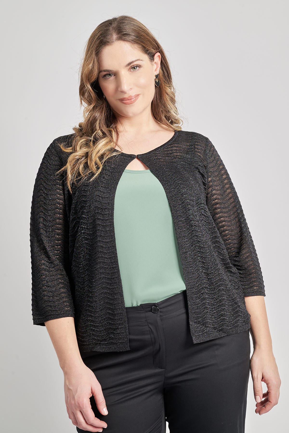 - Ζακέτα κοντή σε στυλ μπολερό με διάτρητη κυματιστή πλέξη. Κούμπωμα στο λαιμό. Ίσια 3/4 μανίκια. Σε ριχτή γραμμή. Το μοντέλο έχει ύψος 180 εκ, στήθος 107, μέση 95, περιφέρεια 122 και φοράει το μέγεθος S