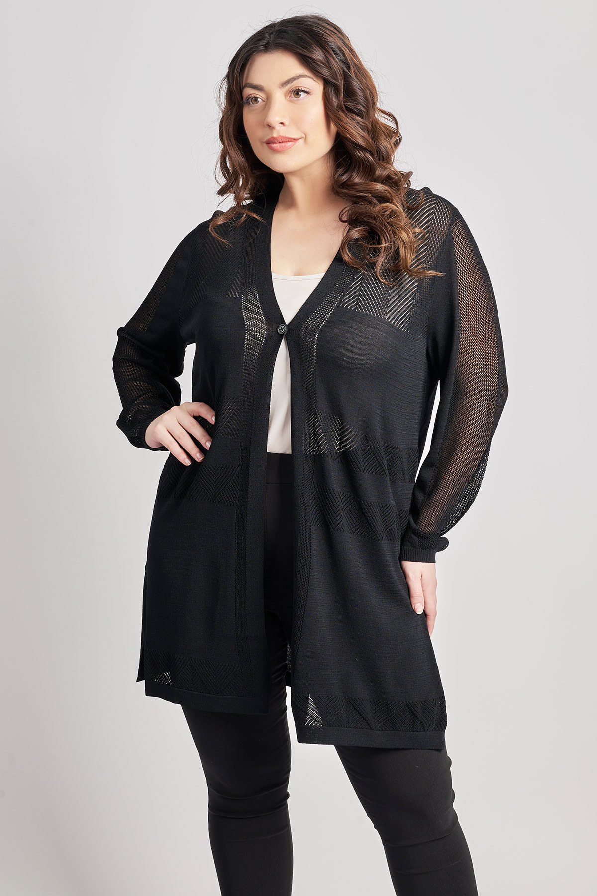 - Μακριά ζακέτα σε συνδυασμό πλέξης. Κλείνει με κουμπί μπροστά και διαθέτει μακριά μανίκια. Ημιδιάφανες λεπτομέρειες. Το μοντέλο έχει ύψος 172 εκ, στήθος 108, μέση 94, περιφέρεια 111 και φοράει το μέγεθος S