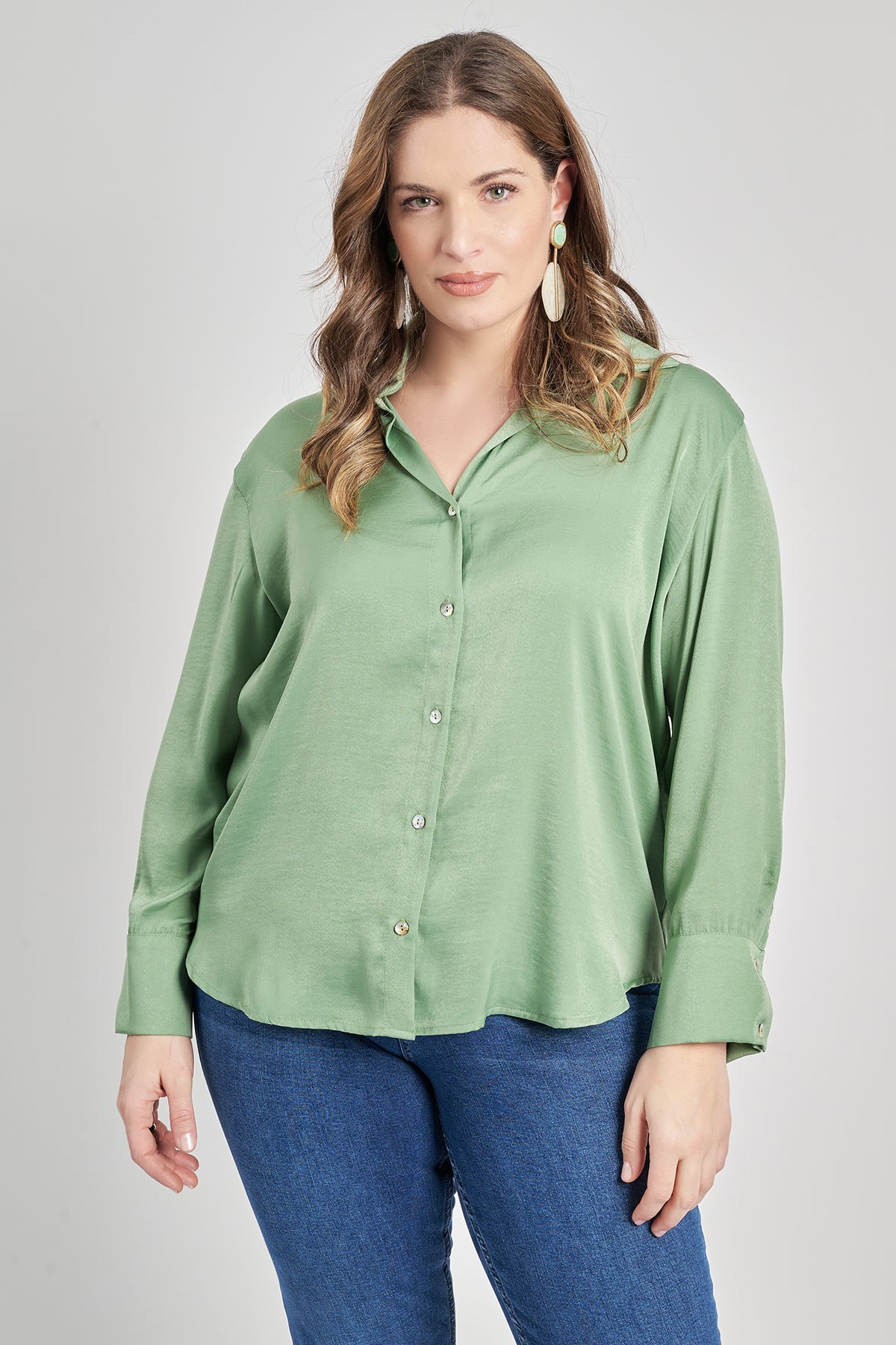 - Πουκάμισο σατινέ σε γκοφρέ υφή washed. Μακριά μανίκια με με κούμπωμα στην μανσέτα. Κλέισιμι μπροστά με κουμπιά κατά μήκος. Το μοντέλο έχει ύψος 180 εκ, στήθος 107, μέση 95, περιφέρεια 122 και φοράει το μέγεθος S