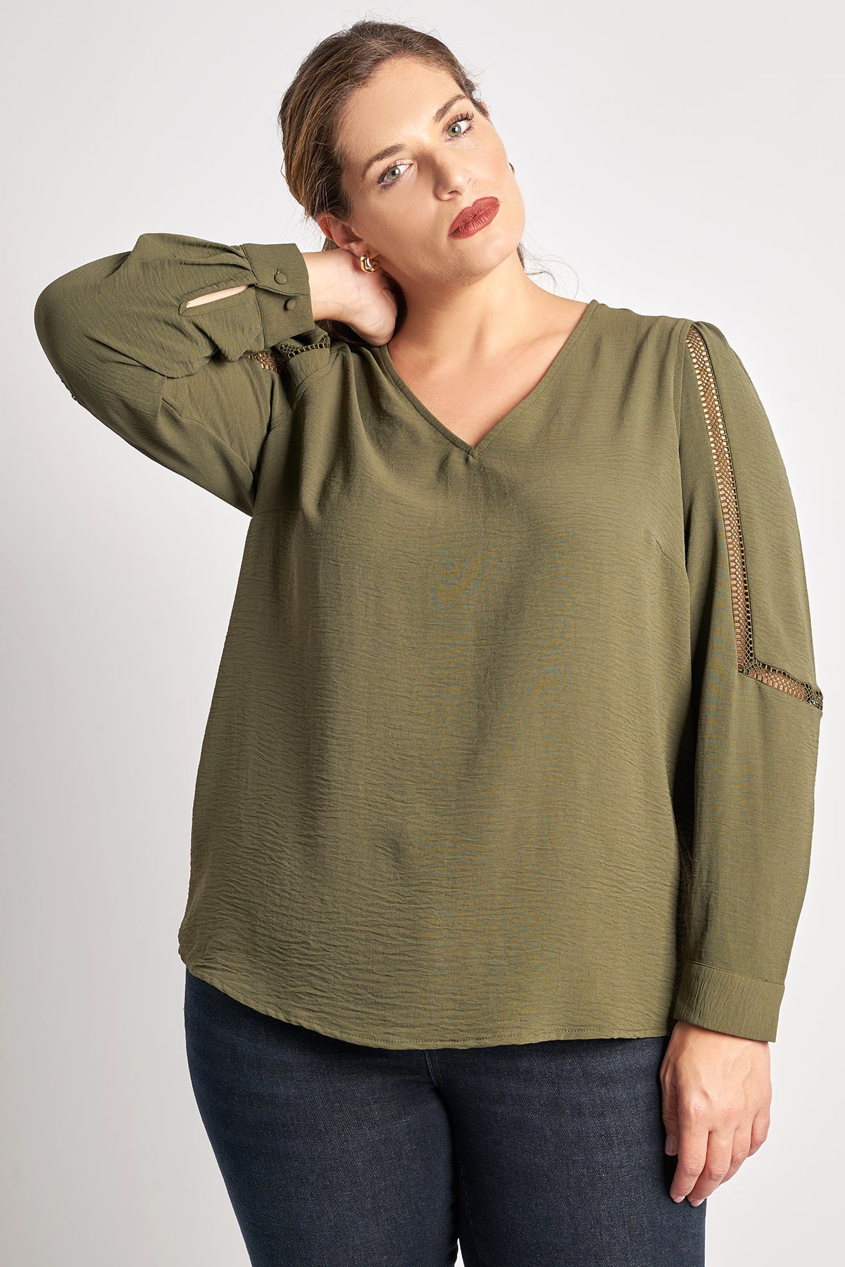 - Μονόχρωμη μπλούζα με μακριά μανίκια. Λαιμόκοψη V και διάτρητη διακόσμηση στα μανίκια.