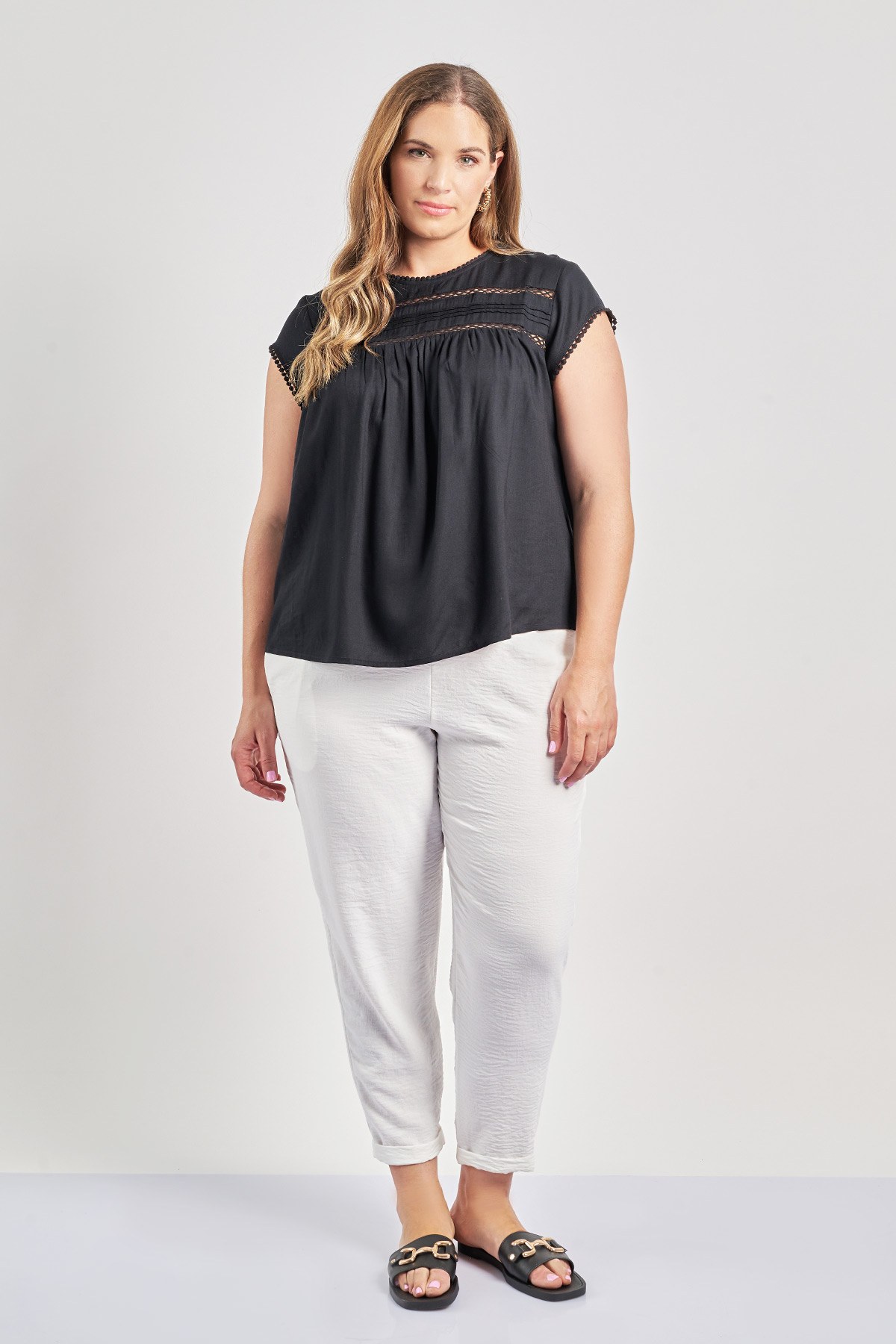 - Παντελόνι 7/8 σε ανάλαφρο ύφασμα washed με ανάγλυφη υφή. Ελαστική μέση με φάσα μπροστά. Με πλαϊνές τσέπες. Γραμμή tapered που στενεύει στο τελείωμα. Με ρεβέρ. Συμπληρώστε το σετ με τις μπλούζες ή τοπ από το ίδιο ύφασμα washed με κωδικούς 012510107669, 012510105575, 012510108475, 012510107675, 012510108186, 012510105574. Συνδυάζεται επίσης με το washed μπλέιζερ με κωδικό 012410705869. Το μοντέλο που φοράει τα χρώματα μαύρο και μπλε έχει ύψος 180 εκ, στήθος 107, μέση 95, περιφέρεια 122 και φοράει το μέγεθος S. Το μοντέλο που φοράει τα χρώματα εκρού και ίντιγκο έχει ύψος 177εκ, στήθος 110, μέση 85, περιφέρεια 115 και φοράει μέγεθος S.