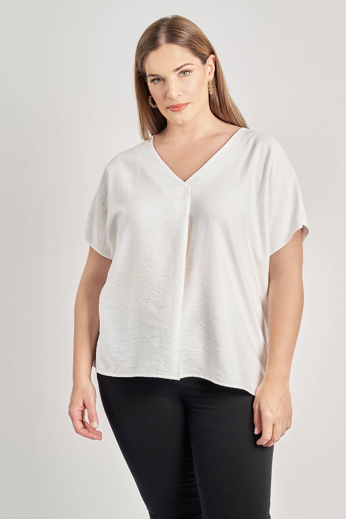 - Μπλούζα από σύμμεικτο ρεγιόν σε όψη λινού. Κοντά άνετα μανίκια ζαπονέ. V λαιμόκοψη με κουφόπιετα στο τελείωμα. Ραφή με κουφόπιετα στην πλάτη. Σε ίσια, άνετη γραμμή. Δε διαθέτει ελαστικότητα. Το μοντέλο έχει ύψος 180 εκ, στήθος 107, μέση 95, περιφέρεια 122 και φοράει το μέγεθος S
