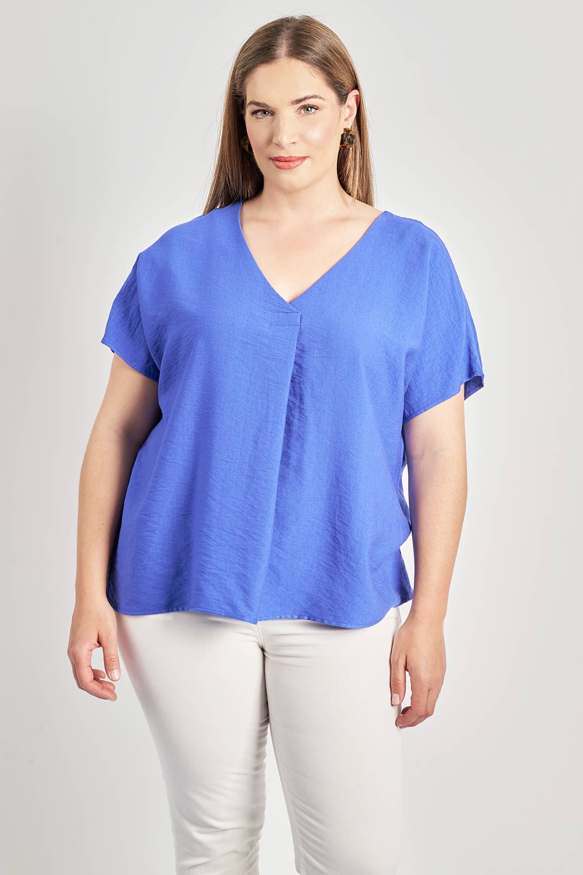 - Μπλούζα από σύμμεικτο ρεγιόν σε όψη λινού. Κοντά άνετα μανίκια ζαπονέ. V λαιμόκοψη με κουφόπιετα στο τελείωμα. Ραφή με κουφόπιετα στην πλάτη. Σε ίσια, άνετη γραμμή. Δε διαθέτει ελαστικότητα. Το μοντέλο έχει ύψος 180 εκ, στήθος 107, μέση 95, περιφέρεια 122 και φοράει το μέγεθος S