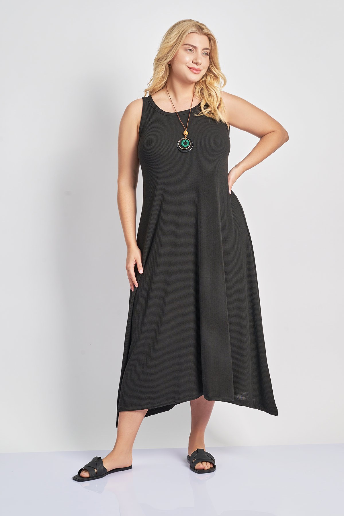 - Αμάνικο μακρύ φόρεμα σε ριπ μαλακή ύφανση. Στρογγυλή λαιμόκοψη. Ασύμμετρο κλος τελείωμα. Διατίθεται με μακρύ κολιέ. Το μοντέλο έχει ύψος 177εκ, στήθος 110, μέση 85, περιφέρεια 115 και φοράει μέγεθος S