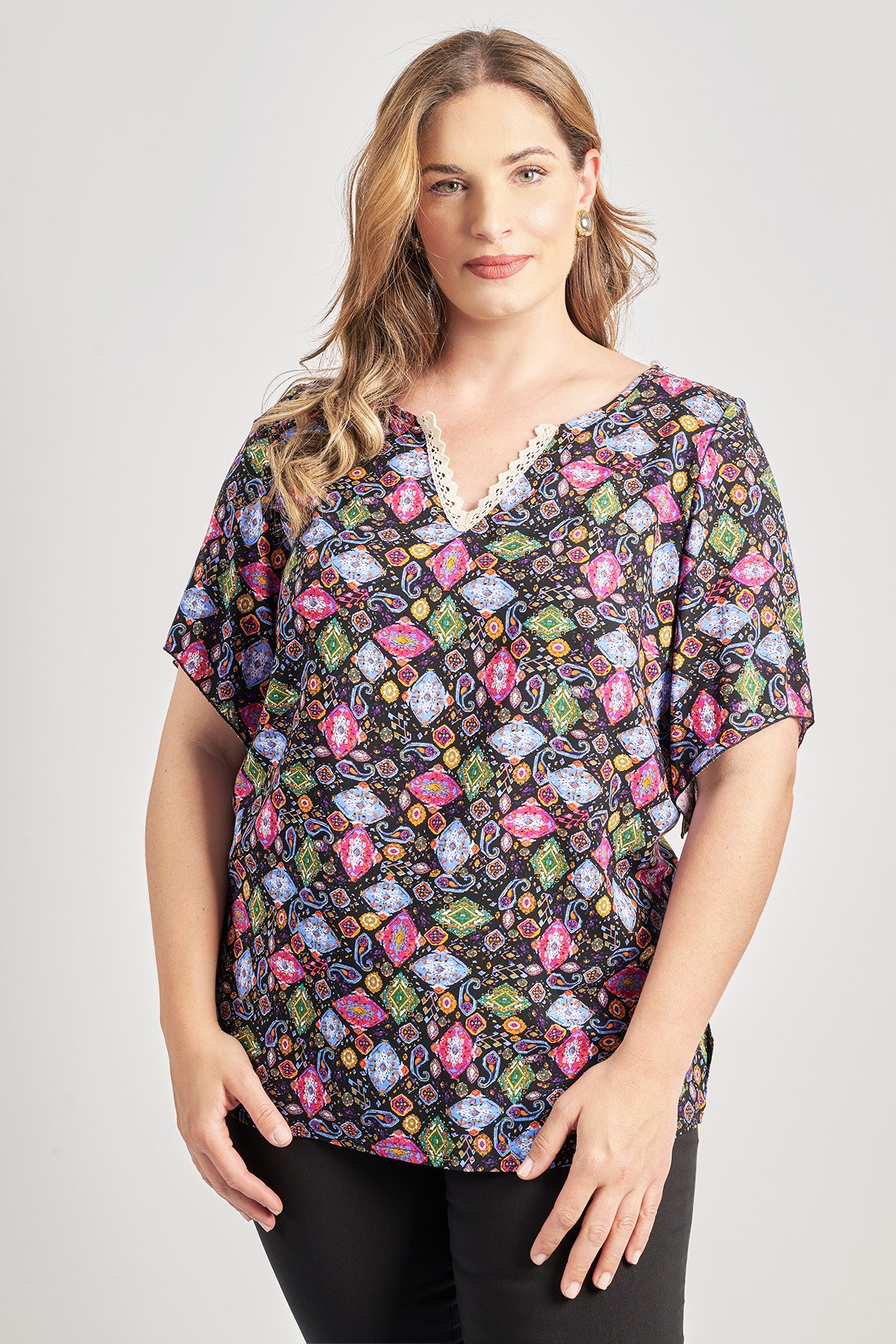 - Μπλούζα εμπριμέ από 100% ρεγίον. Κοντά μανίκια και λεαιμόκοψη V με διακόσμηση δαντέλας. Το μοντέλο έχει ύψος 180 εκ, στήθος 107, μέση 95, περιφέρεια 122 και φοράει το μέγεθος S