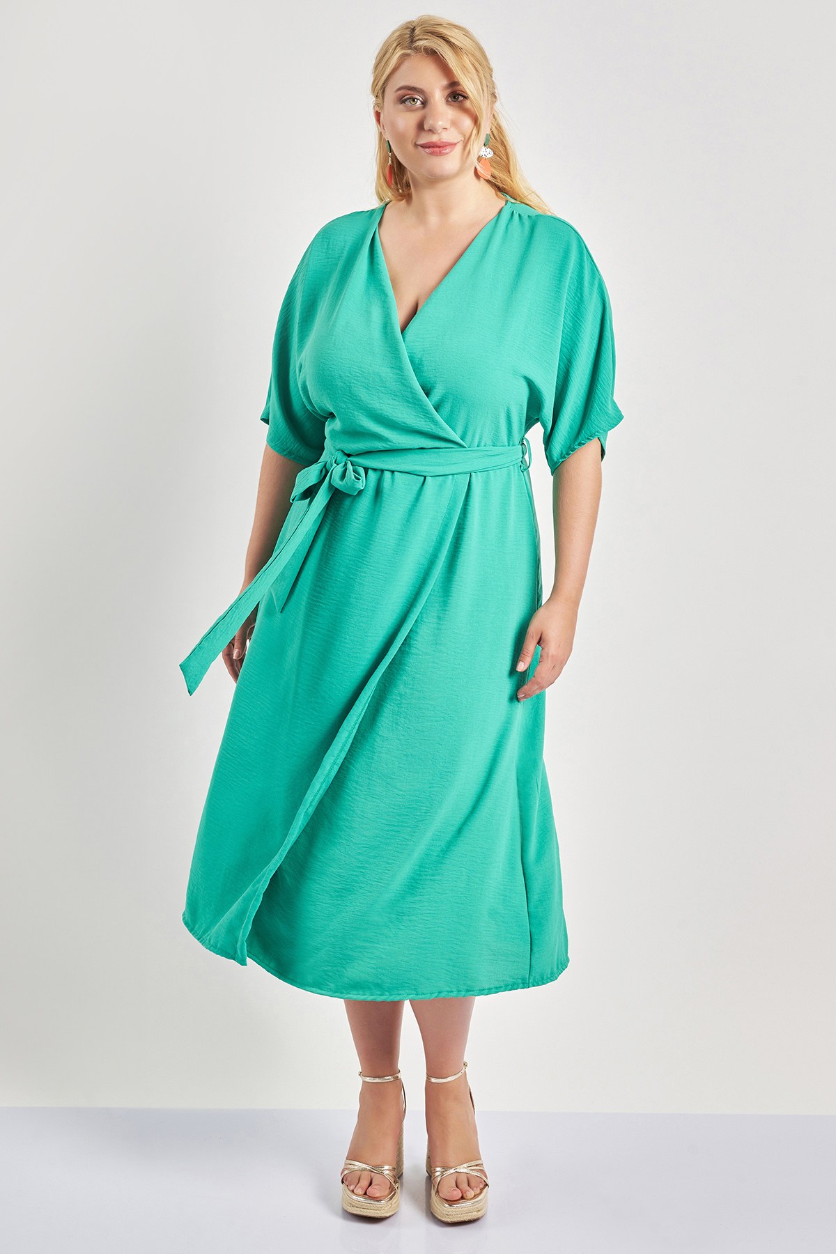 - Μίντι φόρεμα από ανάλαφρο ύφασμα washed με ανάγλυφη υφή. Κρουαζέ ντεκολτέ. Ελαστική μέση. Θηλάκια ζώνης και ζώνη ιδίας ύφανσης. Κοντά μανίκια ζαπονέ. Το μοντέλο έχει ύψος 172 εκ, στήθος 108, μέση 94, περιφέρεια 111 και φοράει το μέγεθος S