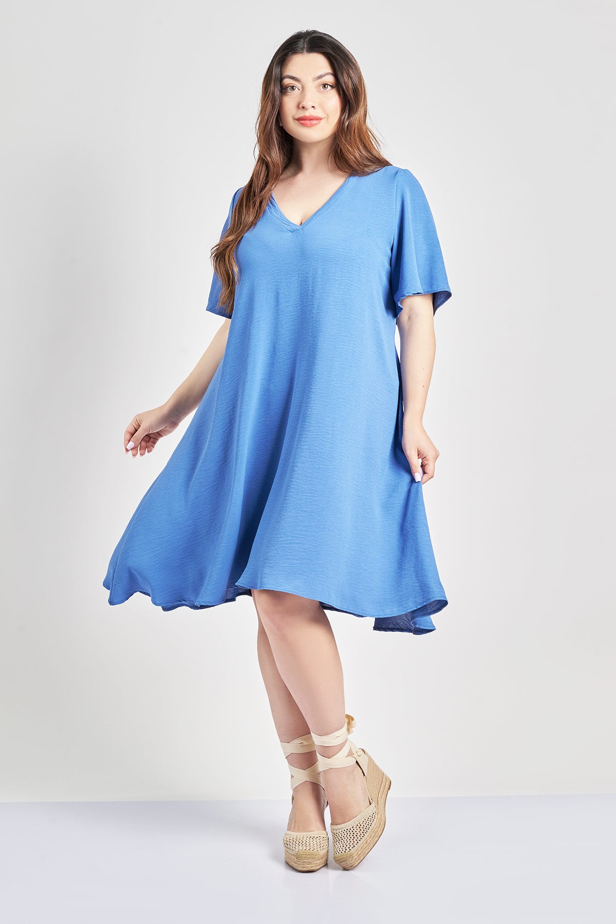 - Μίντι φόρεμα από ανάλαφρο ύφασμα washed με ανάγλυφη υφή. V λαιμόκοψη. Κοντά μανίκια καμπάνα. Ριχτή γραμμή-Α με κλος ασύμμετρο τελείωμα. Ιδανικό για όλη τη μέρα. Το μοντέλο έχει ύψος 172 εκ, στήθος 108, μέση 94, περιφέρεια 111 και φοράει το μέγεθος S