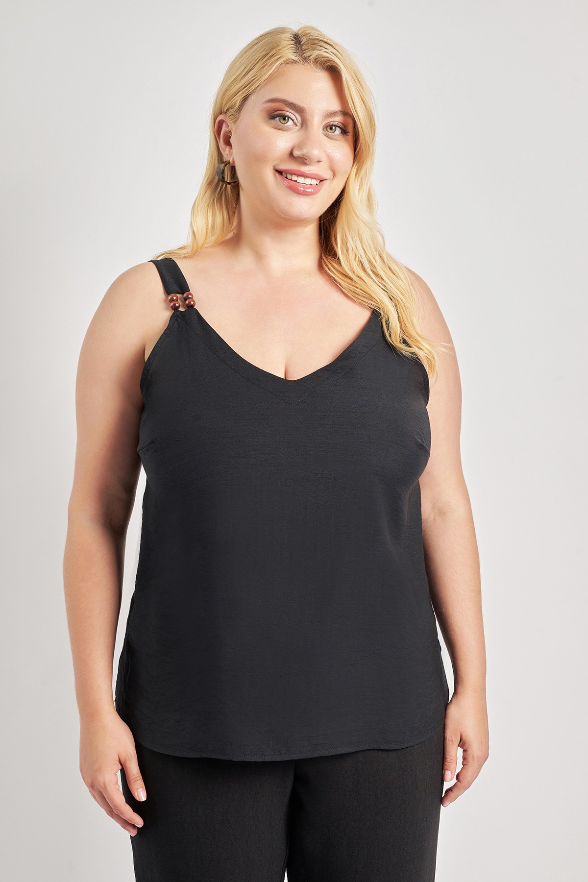 - Μπλούζα με τιράντες σε ποιότητα με όψη λινού. V λαιμόκοψη. Διακοσμητικές μικρές ξύλινες χάντρες στις τιράντες. Στρογγυλεμένο τελείωμα. Κανονική εφαρμογή. Το μοντέλο έχει ύψος 177εκ, στήθος 110, μέση 85, περιφέρεια 115 και φοράει μέγεθος S