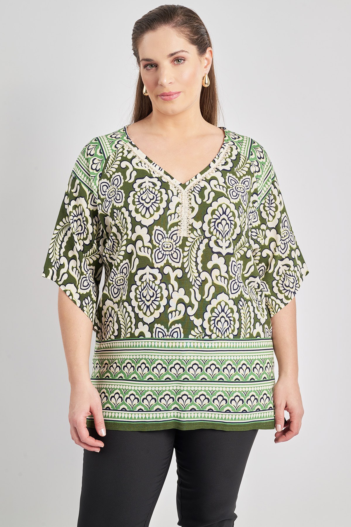 - Μπλούζα σε άνετη γραμμή, σε εμπριμέ έθνικ μοτίβο και μπορντούρα από σύμμεικτο ρεγιόν. V λαιμόκοψη με διακοσμητική τρέσα. Ρεγκλάν κοντά μανίκια σε κλος γραμμή. Πλαϊνά ανοίγματα στο τελείωμα. Το μοντέλο έχει ύψος 180 εκ, στήθος 107, μέση 95, περιφέρεια 122 και φοράει το μέγεθος S