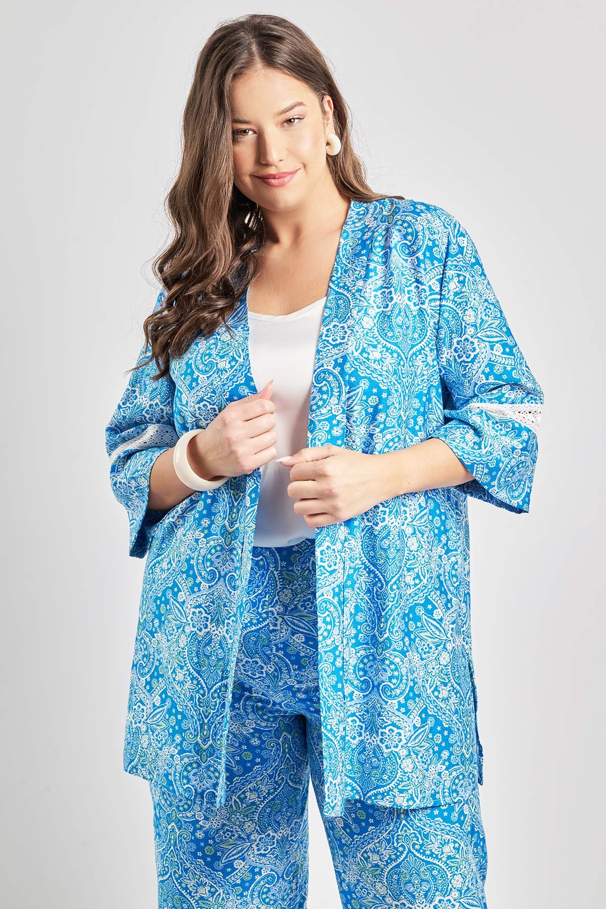 - Κιμονό από σύμμεικτο ρεγιό με linen look σε εμπριμέ με μοτίβο λαχούρια. Μακριά άνετα μανίκια με λεπτομέρεια δαντέλας. Συμπληρώστε το σετ με το παντελόνι 012510208737. Το μοντέλο έχει ύψος 180 εκ, στήθος 114, μέση 88, περιφέρεια 121 και φοράει το μέγεθος S