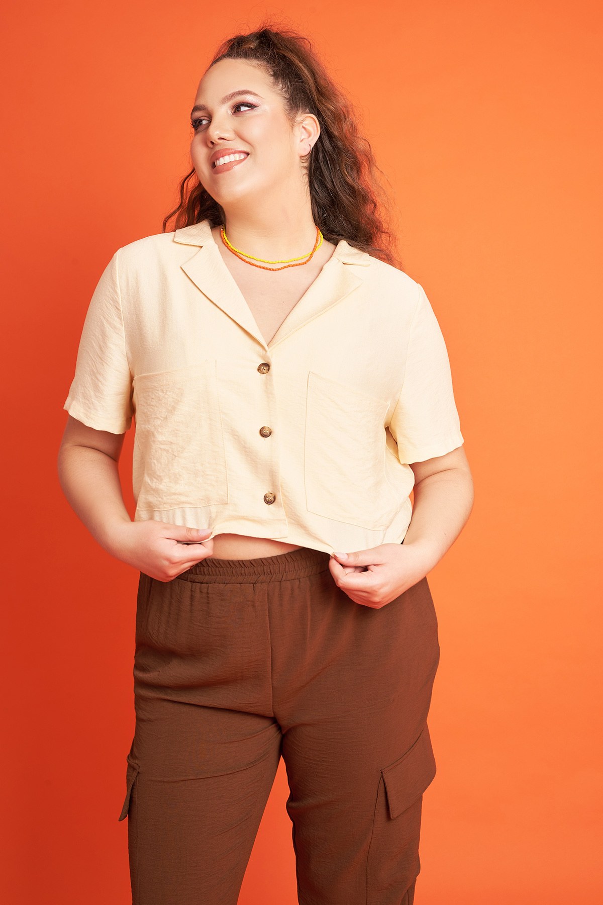 - Crop μονόχρωμο πουκάμισο. Ανάλαφρη ύφανση με υφή και όψη λινού. Πέτο με V. Kλείσιμο μπροστά με κουμπιά. Μεγάλες τσέπες στο μπούστο. Κοντά μανίκια. Συμπληρώστε το σετ με τη βερμούδα με κωδικό 012410206084. Το μοντέλο με τα ξανθά μαλλιά έχει ύψος 177εκ, στήθος 105, μέση 88, περιφέρεια 110 και φοράει μέγεθος M. Το μοντέλο με τα σγουρά μαλλιά έχει ύψος 178εκ, στήθος 108, μέση 94, περιφέρεια 114 και φοράει το μέγεθος Μ