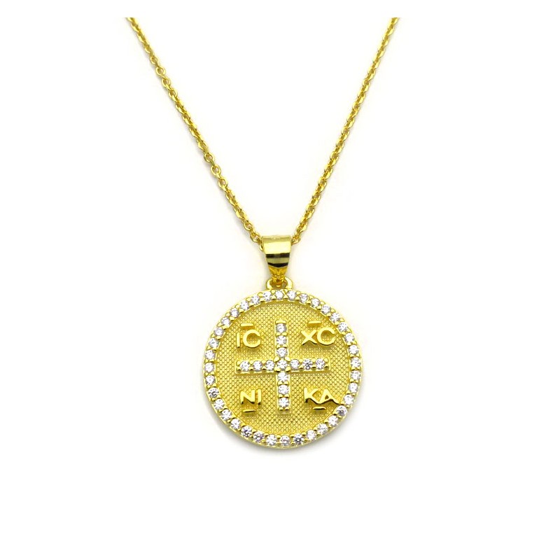 - Κωνσταντινάτο κολιέ IC XC NIKA για το λαιμό με λευκές πέτρες ζιργκόν και αλυσίδα όλο από Ασήμι 925 επιχρυσωμένο. Διάμετρος Κωνσταντινάτου 1,8cm. Μάκρος κολιέ 39-43 cm Ένα υπέροχο κόσμημα για όλες τις ώρες! **Τα επίχρυσα κοσμήματα πρέπει να μένουν μακριά από αρώματα κ ιδρώτα γιατί ενδέχεται να παρουσιάσουν αλλοιώσεις.Εξαιρετικά κρεμαστά Κωνσταντινάτα, υπέροχες ιδέες και για δώρα μαμάς, νονάς! Δείτε όλη τη συλλογή εδώ >> Κολιέ Κωνσταντινάτα