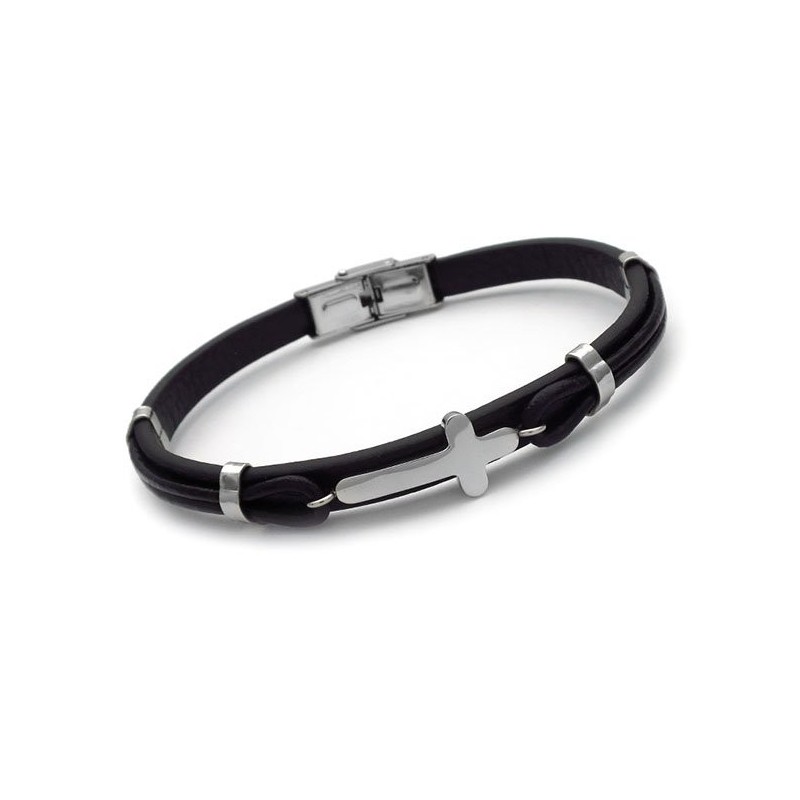 Μοντέρνο ανδρικό βραχιολι με δέρμα μαύρο BA253