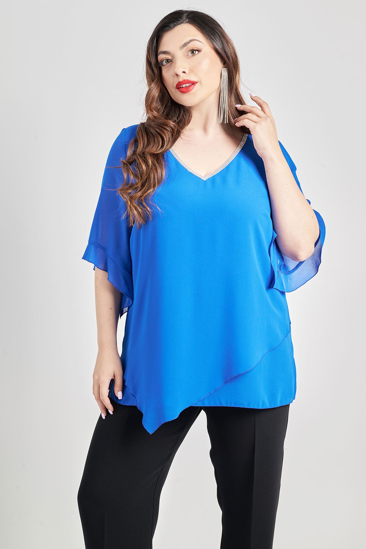 - Βραδινή μπλούζα από ζωρζέτα διπλής στρώσης. V λαιμόκοψη διακοσμημένη με λαμπερά στρας. Μανίκια ημιδιάφανα 2/4 με ασύμμετρο βολάν στο τελείωμα. Σε ίσια γραμμή με ασύμμετρο τελείωμα. Πλαϊνά ανοίγματα στο τελείωμα για άνετη εφαρμογή. Το μοντέλο έχει ύψος 172 εκ, στήθος 108, μέση 94, περιφέρεια 111 και φοράει το μέγεθος S